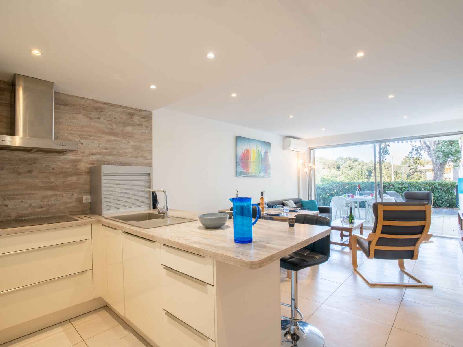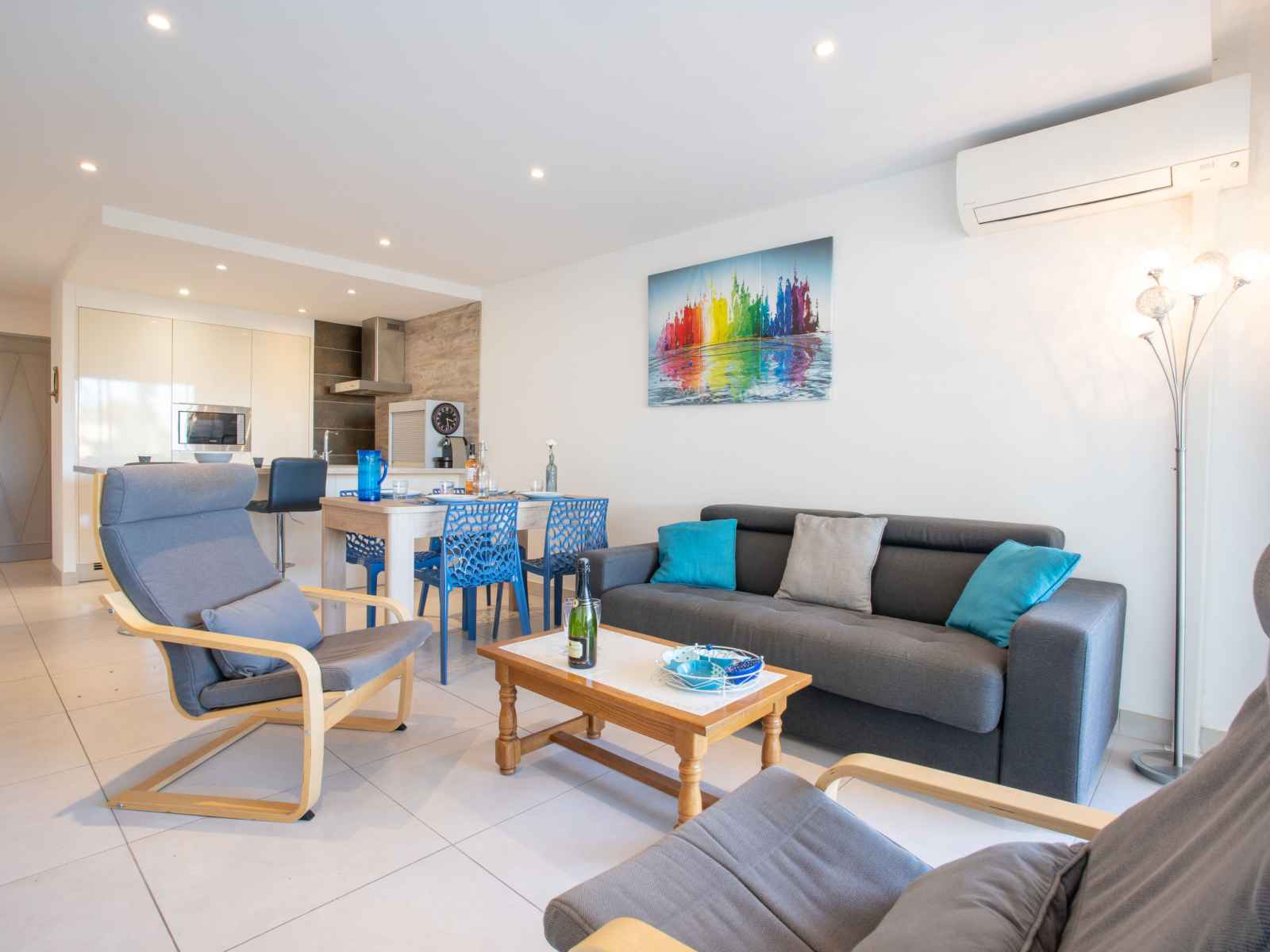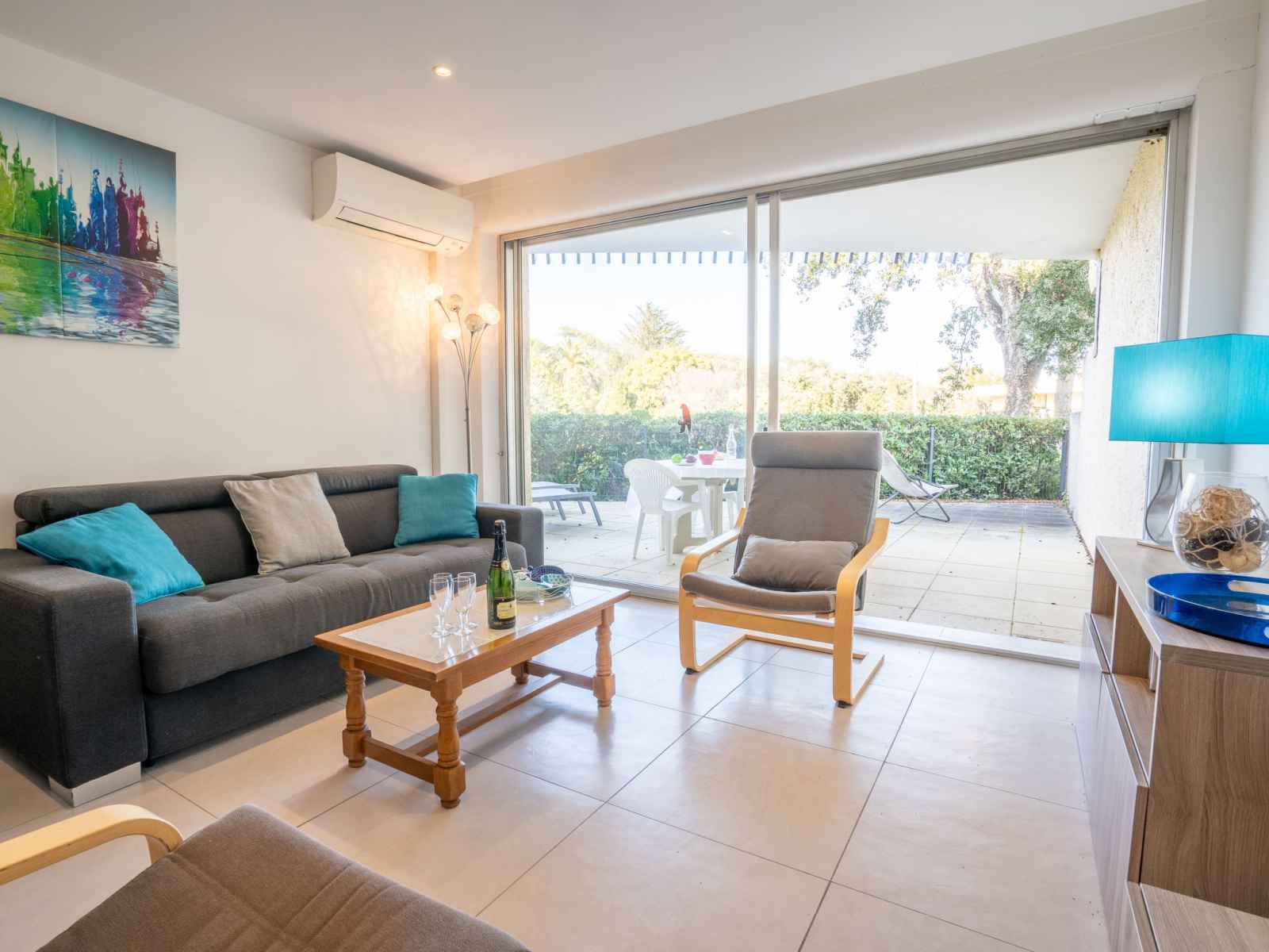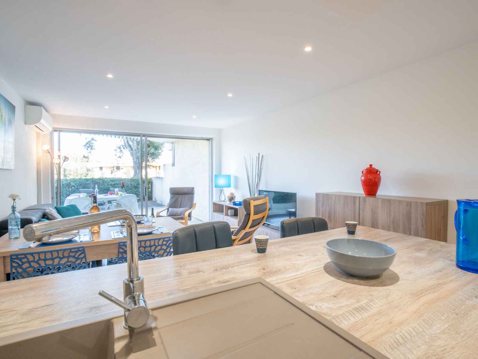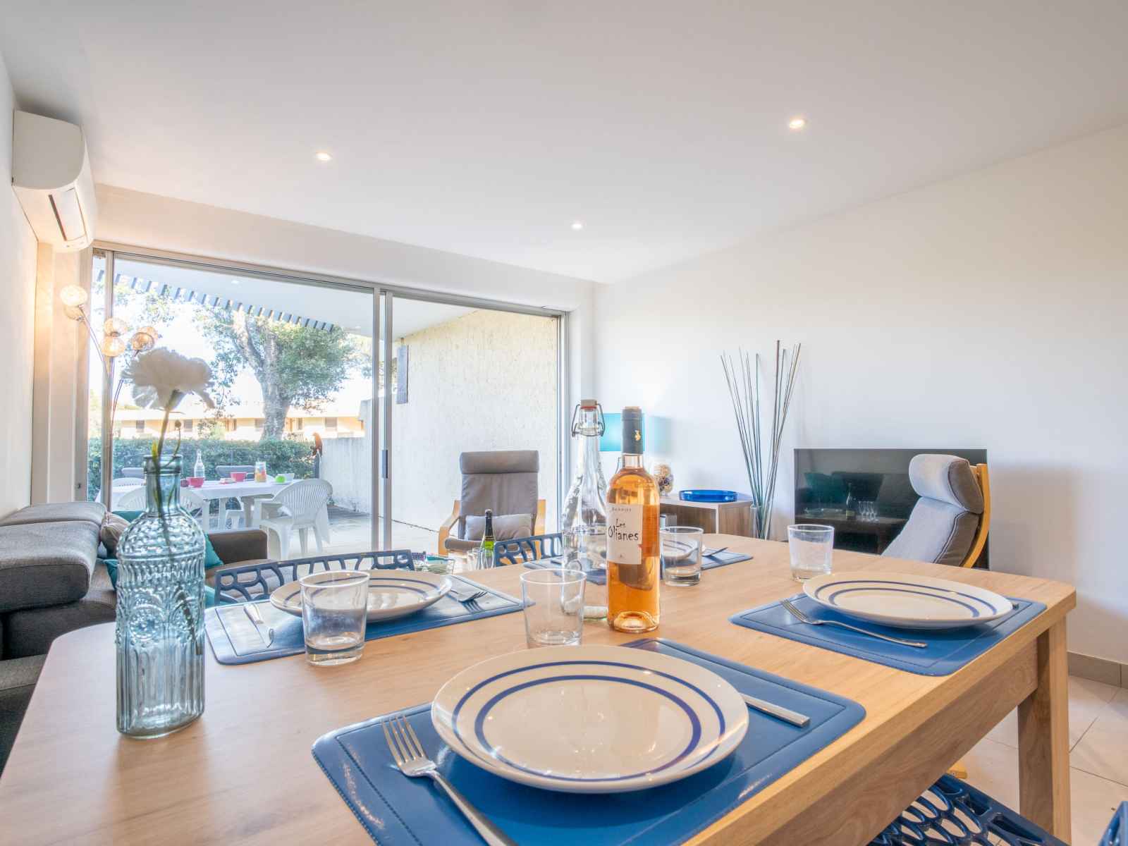 Apt 3 pièces 63 m2, au rez-de-chaussée, situation ouest. rénové en 2020, aménagement confortable et moderne: séjour/salle à manger avec baie vitrée avec tv (écran plat), air-conditionné. sortie sur la terrasse. 1 chambre avec baie vitrée avec 2 lits (90 cm, longueur 200 cm), air-conditionné. sortie sur la terrasse. 1 chambre avec 2