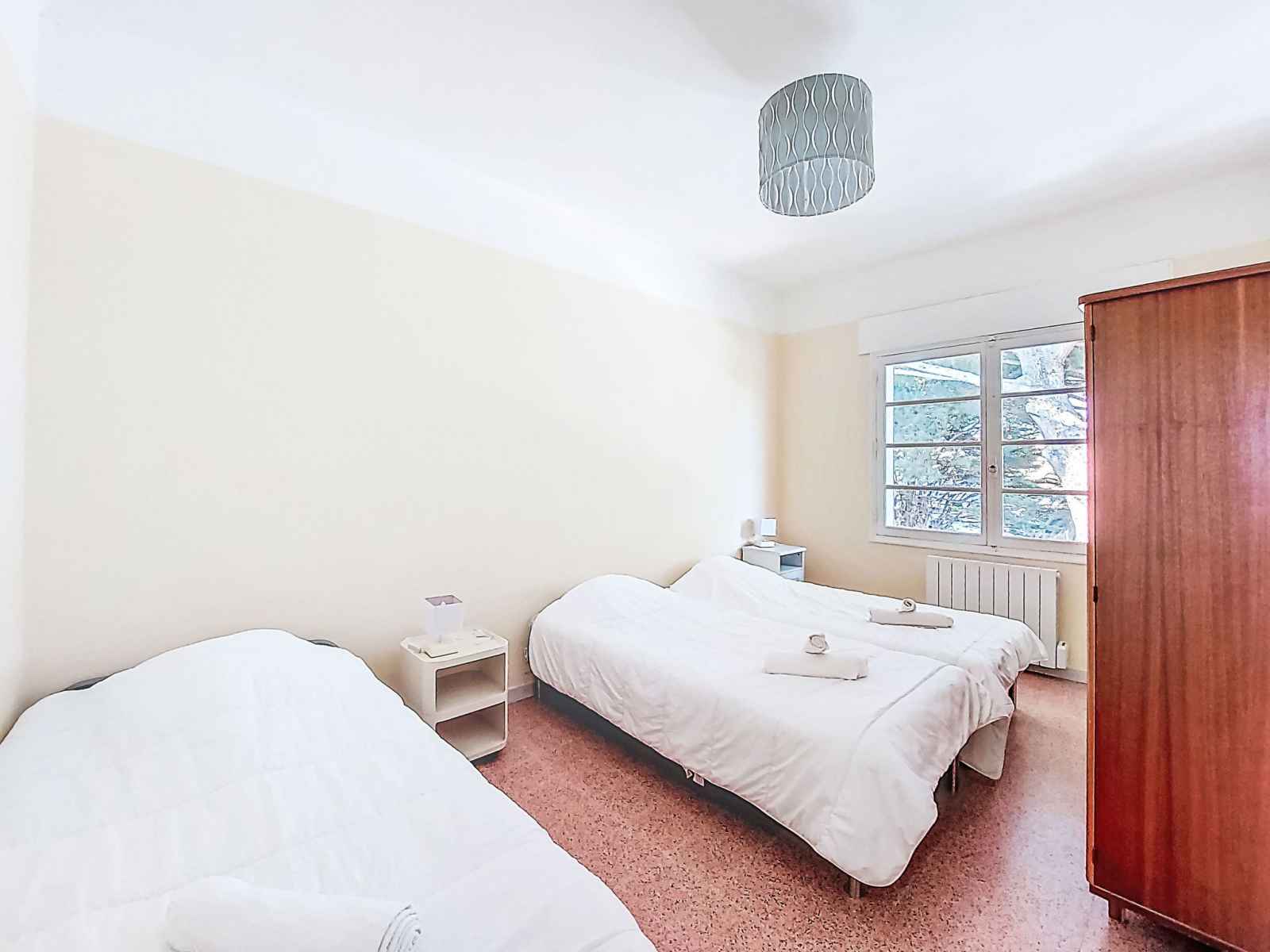 Apt 3 pièces 65 m2 au 2ème étage, situation sud-ouest. séjour/salle à manger avec tv et air-conditionné. sortie sur la terrasse, orientée sud. 1 chambre avec 2 lits (90 cm, longueur 190 cm). sortie sur le balcon, orientée nord-est. 1 chambre avec 2 lits (90 cm, longueur 190 cm). cuisine (mini-four, 3 plaques à induction, grille-pain,