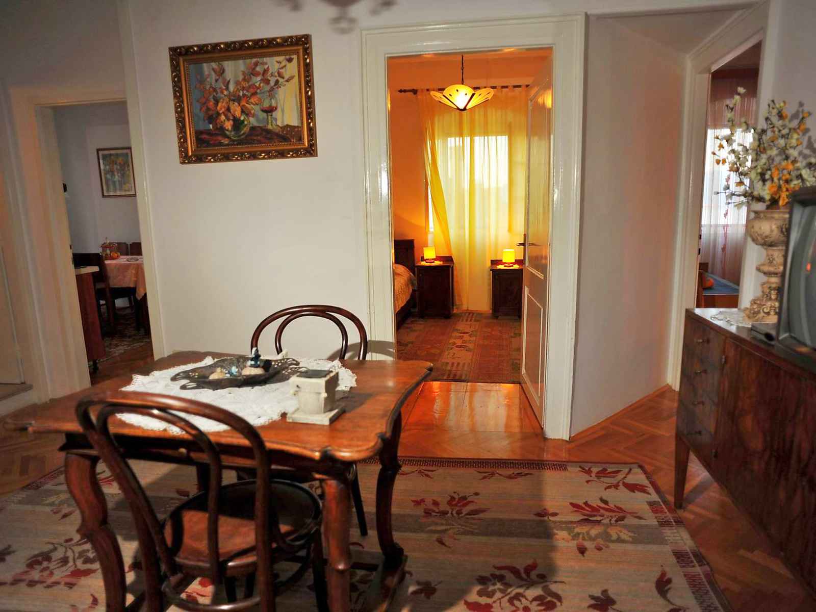 Apt 3 pièces 70 m2 au 2ème étage, situation sud. entrée avec tv. 2 chambres, chaque chambre avec: 2 lits (90 cm, longueur 190 cm). 1 chambre avec 1 lit double (2 x 90 cm, longueur 190 cm). cuisine (4 plaques de cuisson, four, congélateur) avec table pour les repas. douche/wc. a disposition: internet (connexion wifi, gratuit).