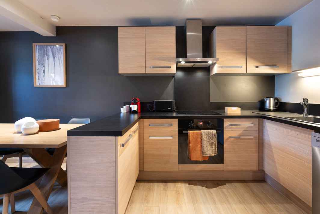 cuisine : four, micro-ondes, plaques vitrocéramiques, hotte, réfrigérateur/congélateur, lave vaisselle, cafetière nespresso