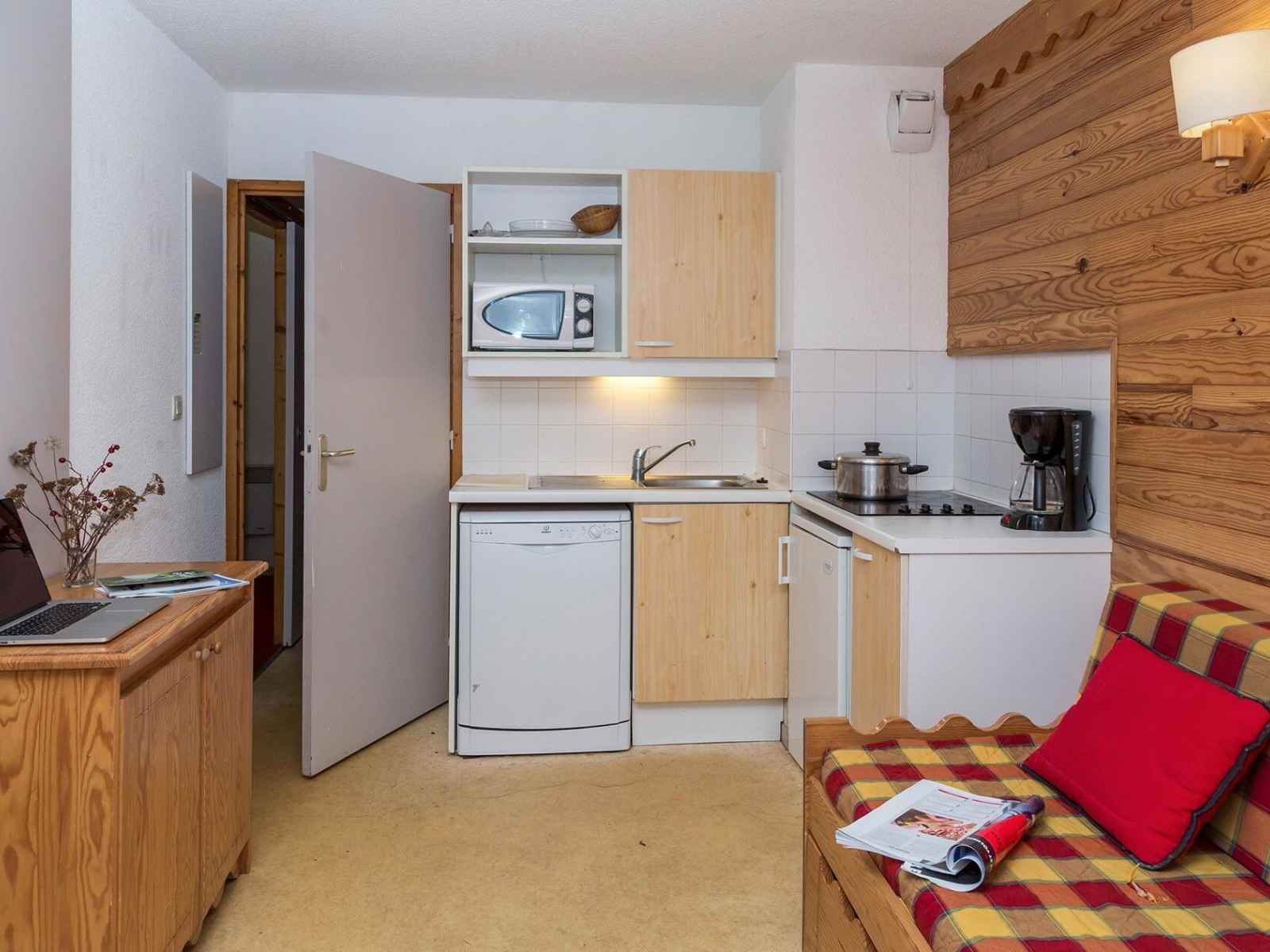kitchenette équipée (plaque vitrocéramique, micro-ondes, réfrigérateur, lave-vaisselle, cafetière électrique, bouilloire et grille-pain)