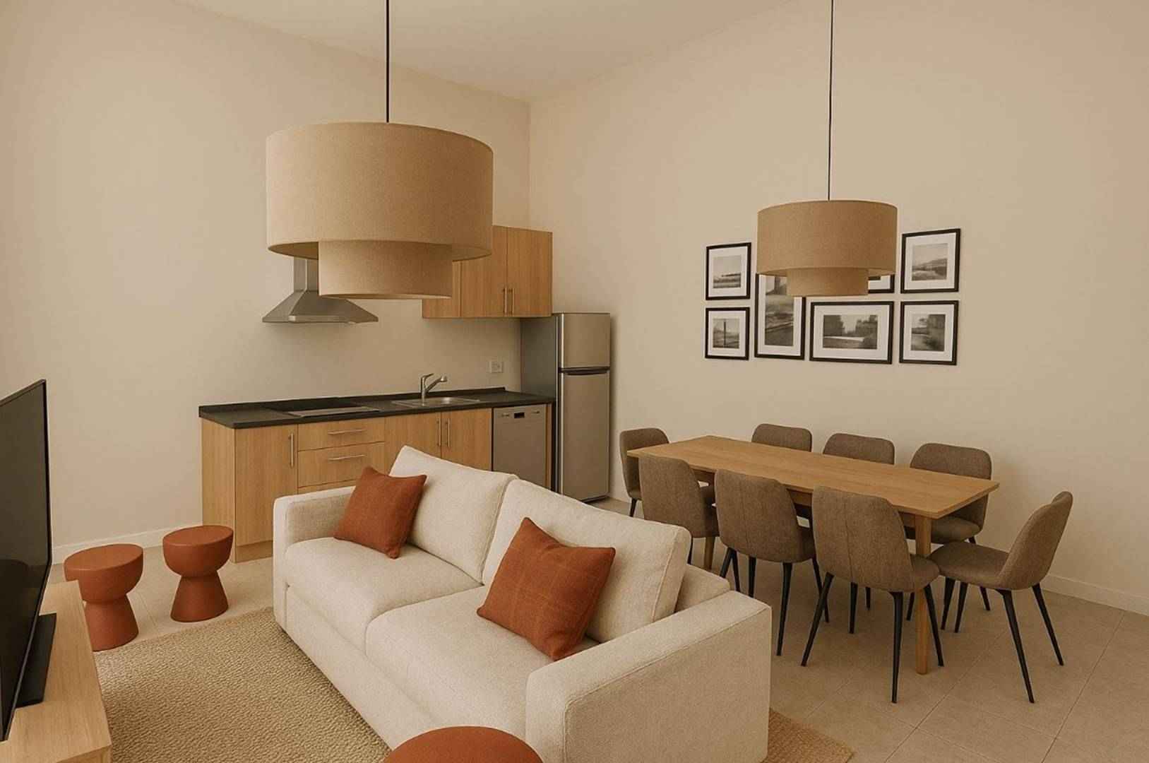 entrée, donnant sur la pièce à vivre avec sa cuisine entièrement équipée ouverte sur l'espace repas et salon avec un canapé convertible et accès au balcon