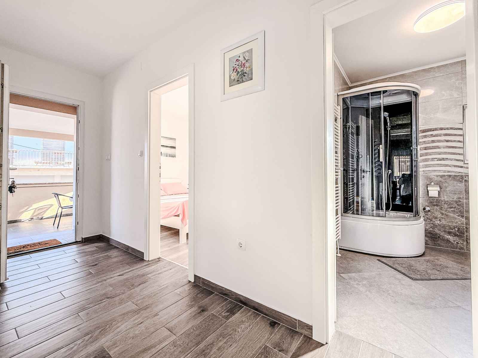 Apt 3 pièces 80 m2 au 2ème étage. 2 chambres doubles. cuisine/séjour) avec 1 divan-lit, tv (satellite) et air-conditionné. bain/wc. air-conditionné (en sus). grande terrasse 40 m2, situation sud. meubles de terrasse. belle vue sur la mer.