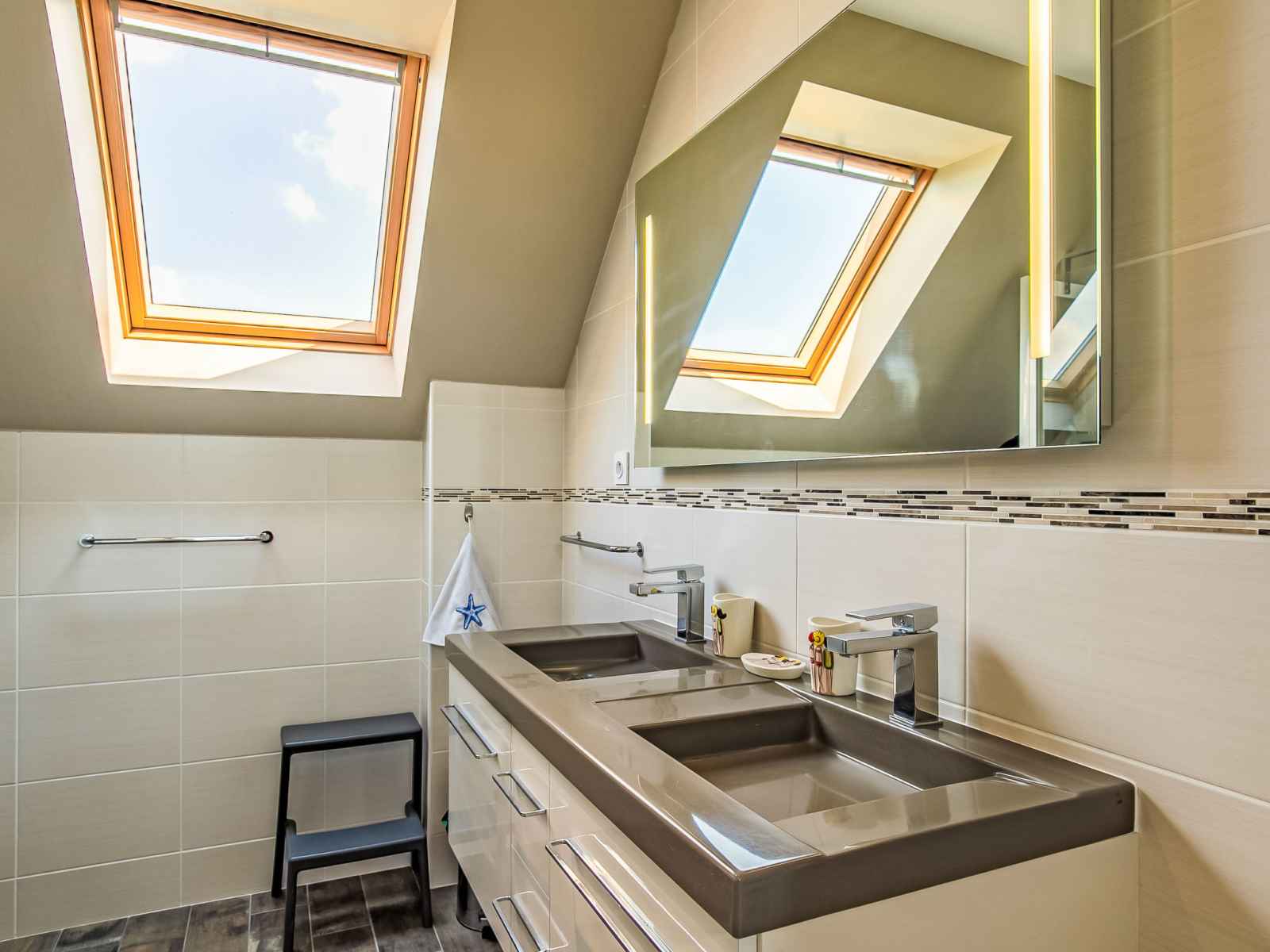 lave-vaisselle, 3 plaques à induction, grille-pain, bouilloire électrique, micro-ondes, congélateur, cafetière électrique). Douche, WC séparé, double vasque. Chauffage électrique. Grand balcon 30 m2, pelouse 300 m2. Mobilier de balcon, barbecue (portable), chaises longues (3). Vue latérale sur l'océan. A disposition: lave-linge, fer à repasser. Internet (Connexion WIFI, gratuit). Veuillez noter: logement non-fumeur. Entrée privée, détecteur de fumée. Possibilité de réserver une chambre pour max. 2 personnes avec un lit 1,60m x 2,00m et douche/WC privative, voir frais supplémentaires.