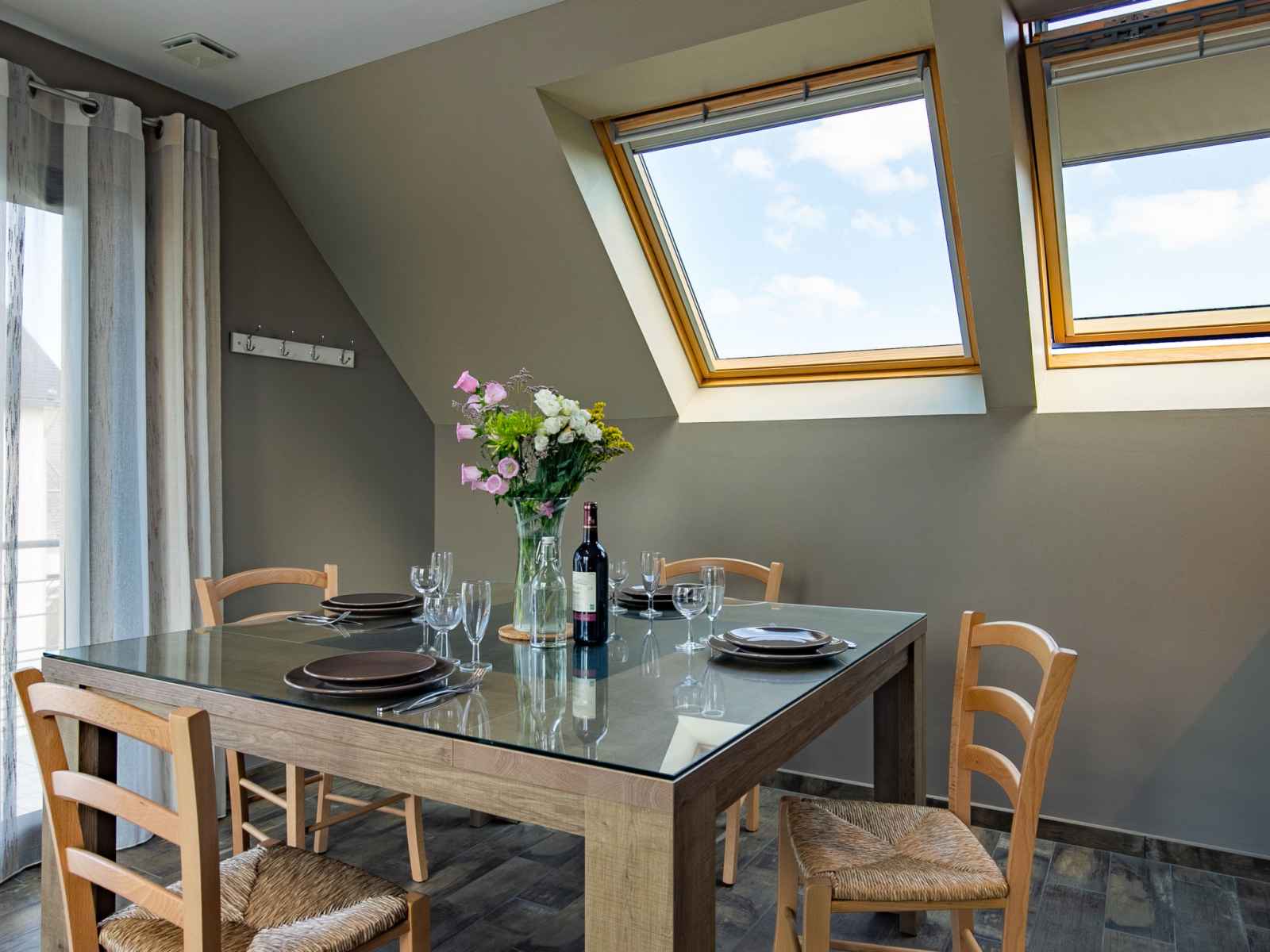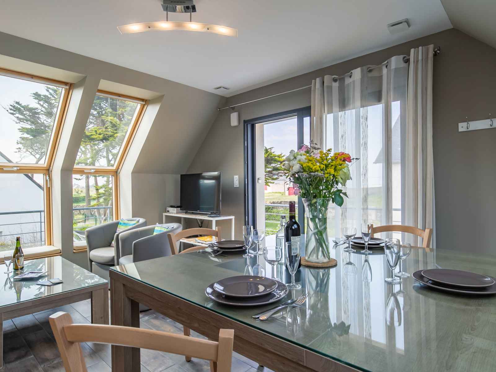 "les chardons bleus 2", apt 4 pièces 90 m2, à l'étage supérieur. aménagement confortable et de bon goût: séjour/salle à manger mansardé avec table pour les repas et tv (satellite) (écran plat). sortie sur le jardin, sur le balcon. 1 chambre mansardée avec 1 grand-lit (160 cm). 1 chambre mansardée avec 2 lits. cuisine ouverte (four,