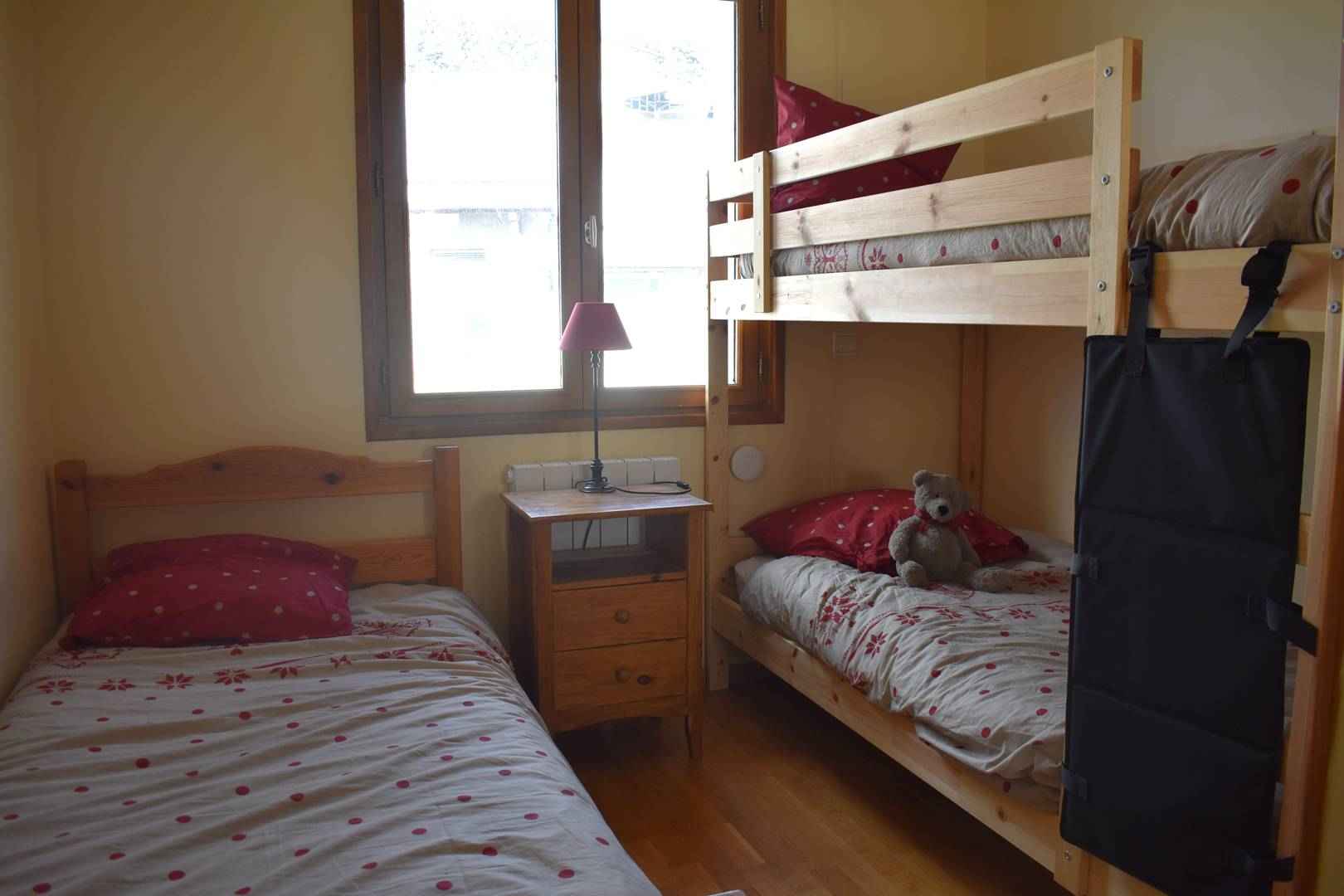 -Une seconde chambre avec deux lits superposés et un lit simple, placard de rangement