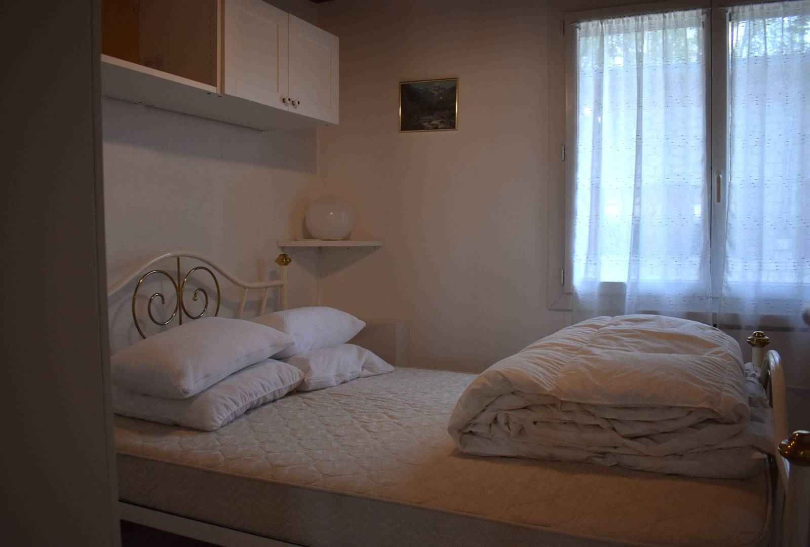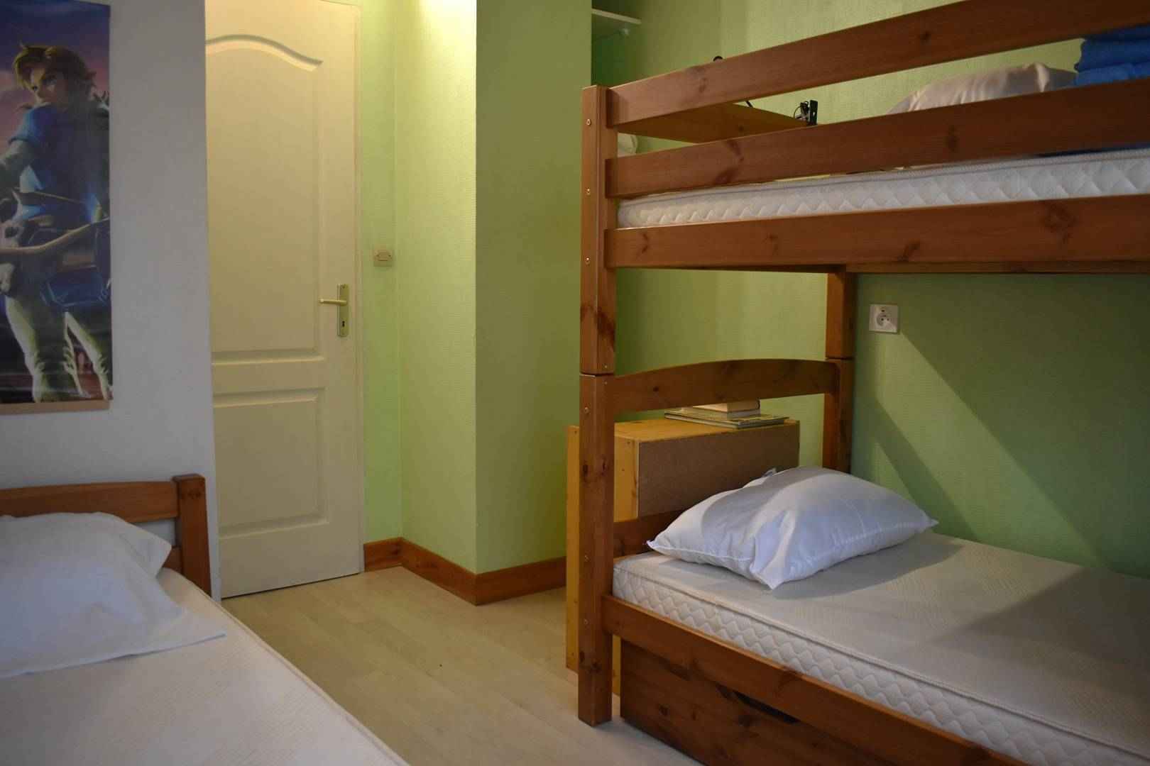 entrée, donnant accès à un dégagement qui donne sur une première chambre avec un lit double et placard de rangement, et une seconde pièce de type chambrette avec deux lits