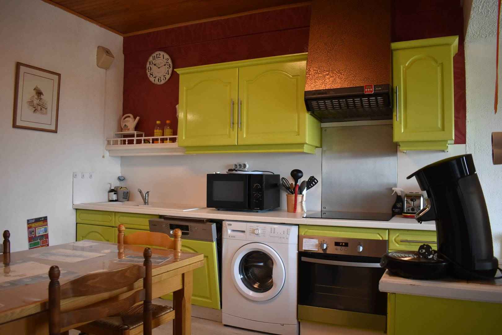 Séjour spacieux avec une grande cuisine équipée ouverte avec lave linge, lave-vaisselle, four, hotte aspirante, plaques de cuissons vitrocéramique, micro-ondes et cafetière SENSEO