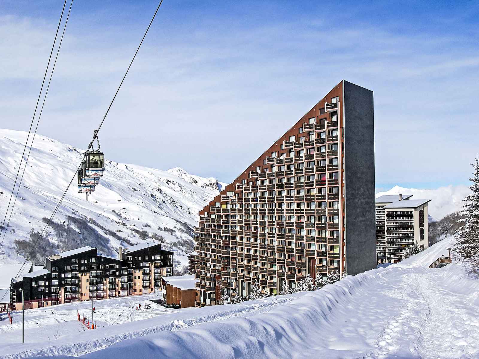 les menuires" 500 m, piscine couverte 100 m. centre sportif 100 m, remontées mécaniques 60 m, pistes de ski 20 m. École de ski 250 m, ski de fond 50 m. veuillez noter: la photo ne montre qu’un exemple de location de vacances. d’autres appartements sont également proposés à la location dans cette maison de vacances. le quartier de preyrand est relié au centre "la croisette' par un télébenne gratuit, ouvert de 8h30 à 23h00.