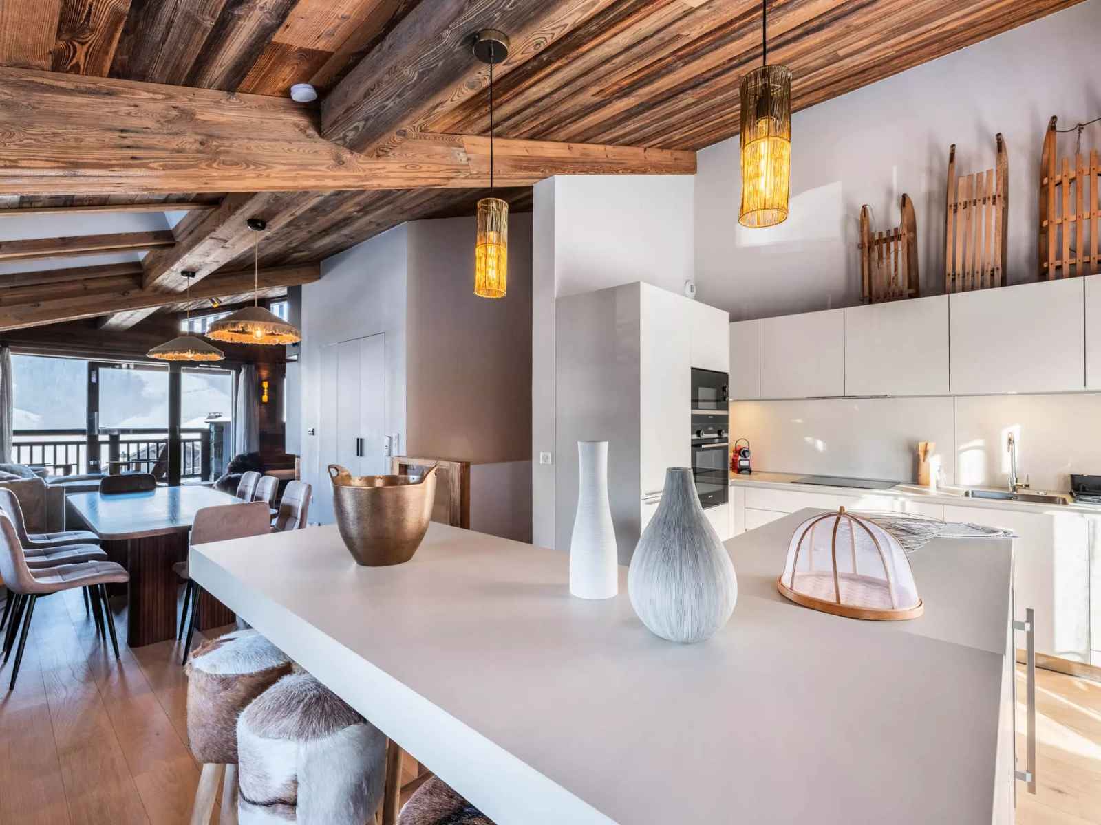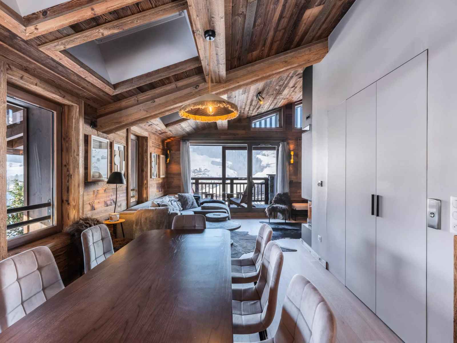 l'appartement stallion f01 de 143 m² est sur 3 étages avec ascenseur, avec un décor moderne et montagne. il accueille confortablement 9 personnes dans 3 chambres, dont une chambre enfants avec lits superposés. la pièce de vie traversante comprend cuisine équipée, espace repas, salon avec cheminée et accès