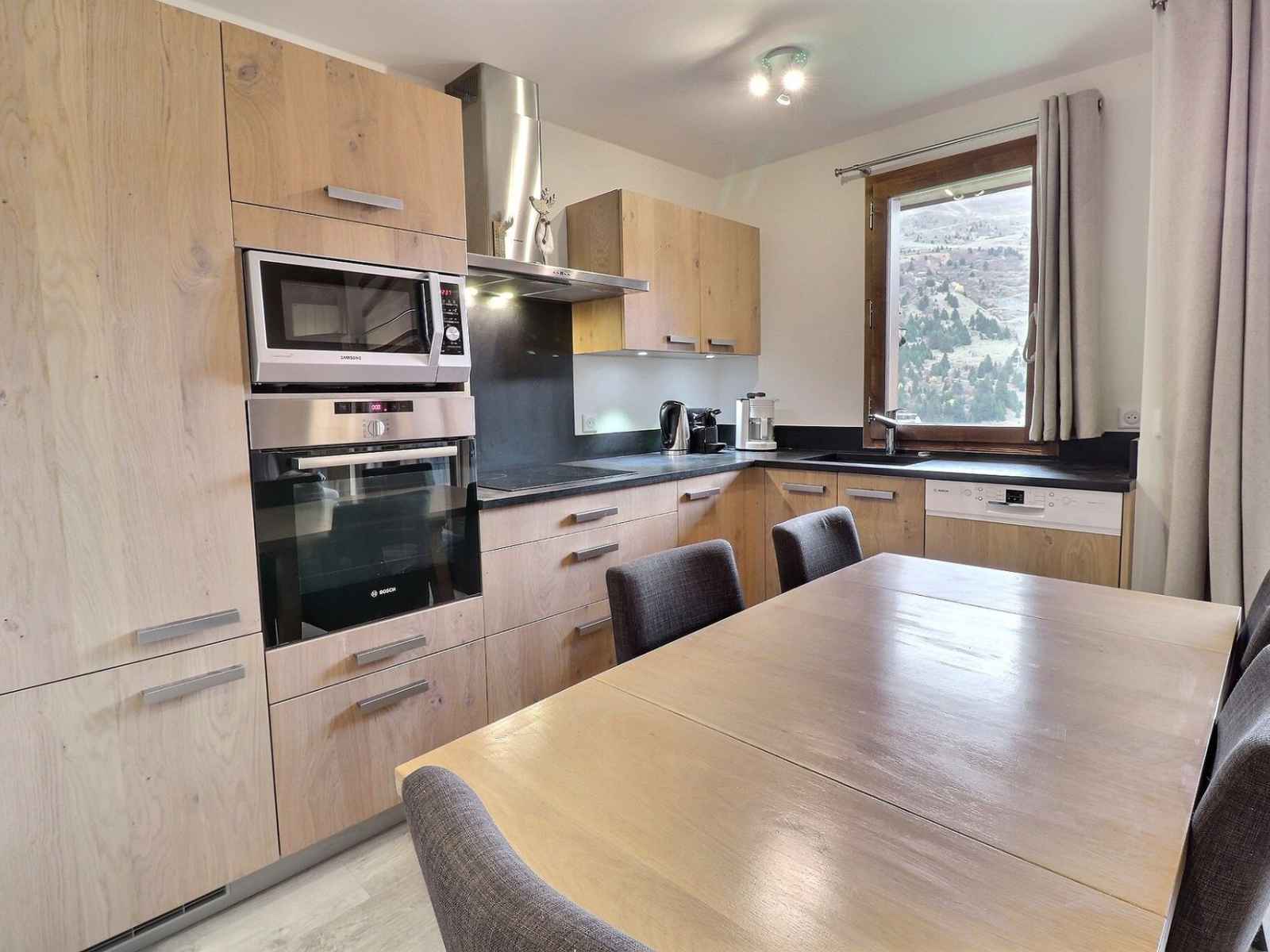 cuisine ouverte : four, frigidaire, 4 plaques vitro-céramique, lave-vaisselle, hotte, cafetière électrique,