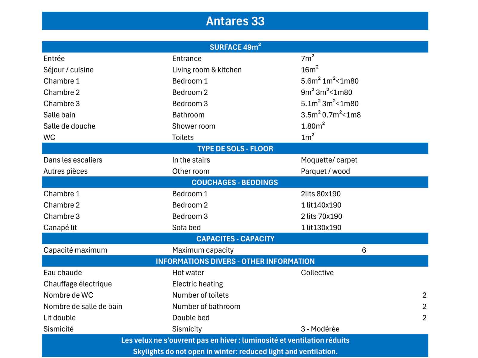 - Caution 1000 € (CB ou chèque détruit au plus tard 14 jours après votre départ)