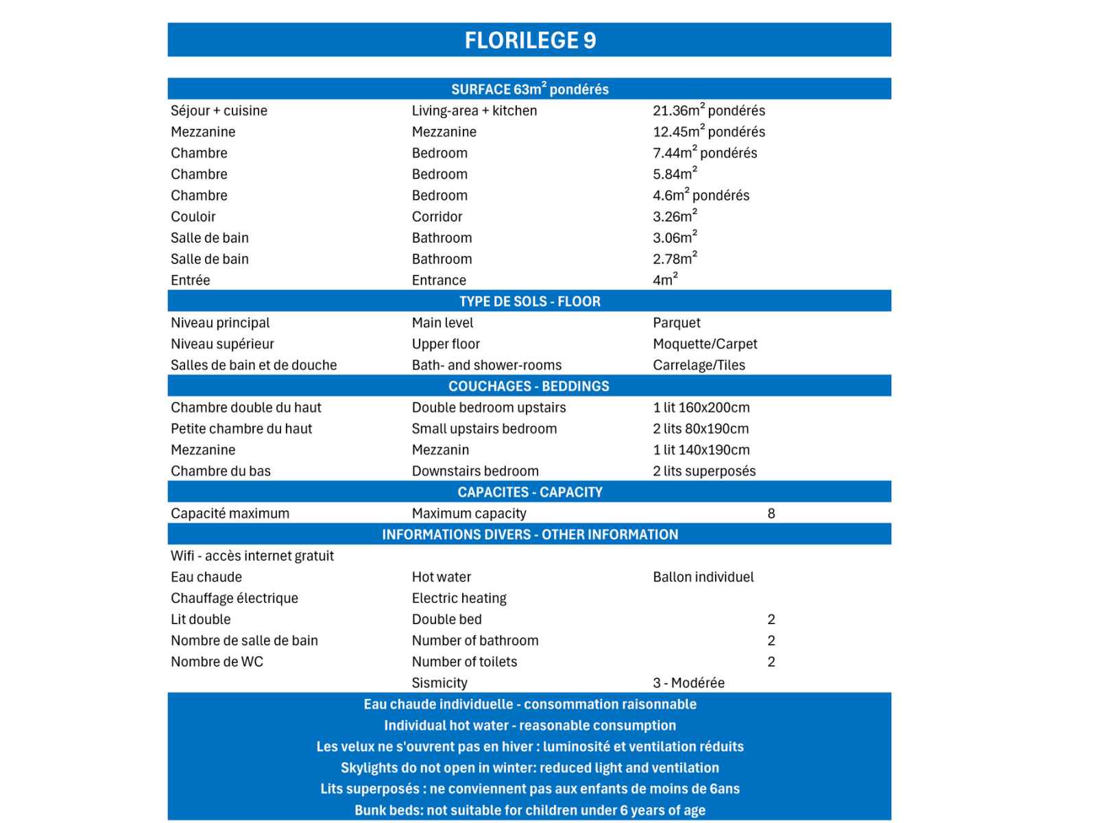 - Caution 800 € (CB ou chèque détruit au plus tard 14 jours après votre départ)