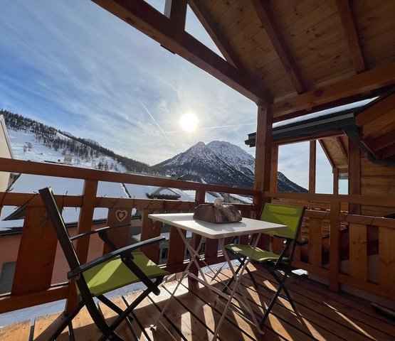 avec terrasse plein sud et garage individuel fermé en sous sol, en cœur de village et à 60m des pistes et 10 m d une supérette.