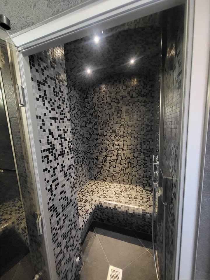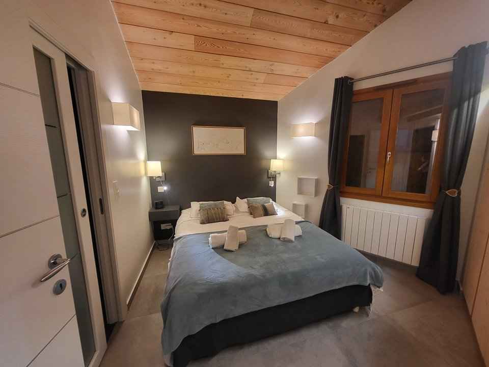 - Une chambre parentale avec un lit 160*200 et donne dans une salle de douche privative. La douche est entièrement habillée de mosaïques, d’une douche à jets et d’un banc.