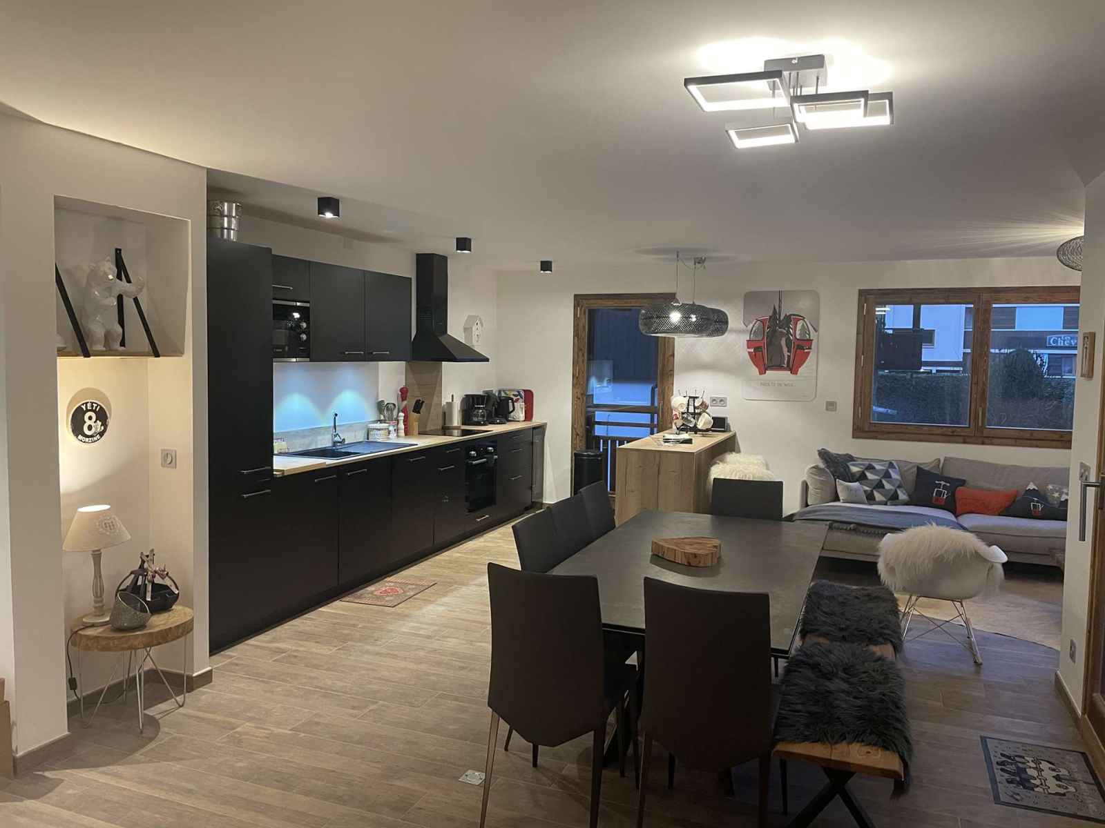 Vaste pièce à vivre avec coin salon et TV, coin repas, cuisine toute équipée et accès à la terrasse