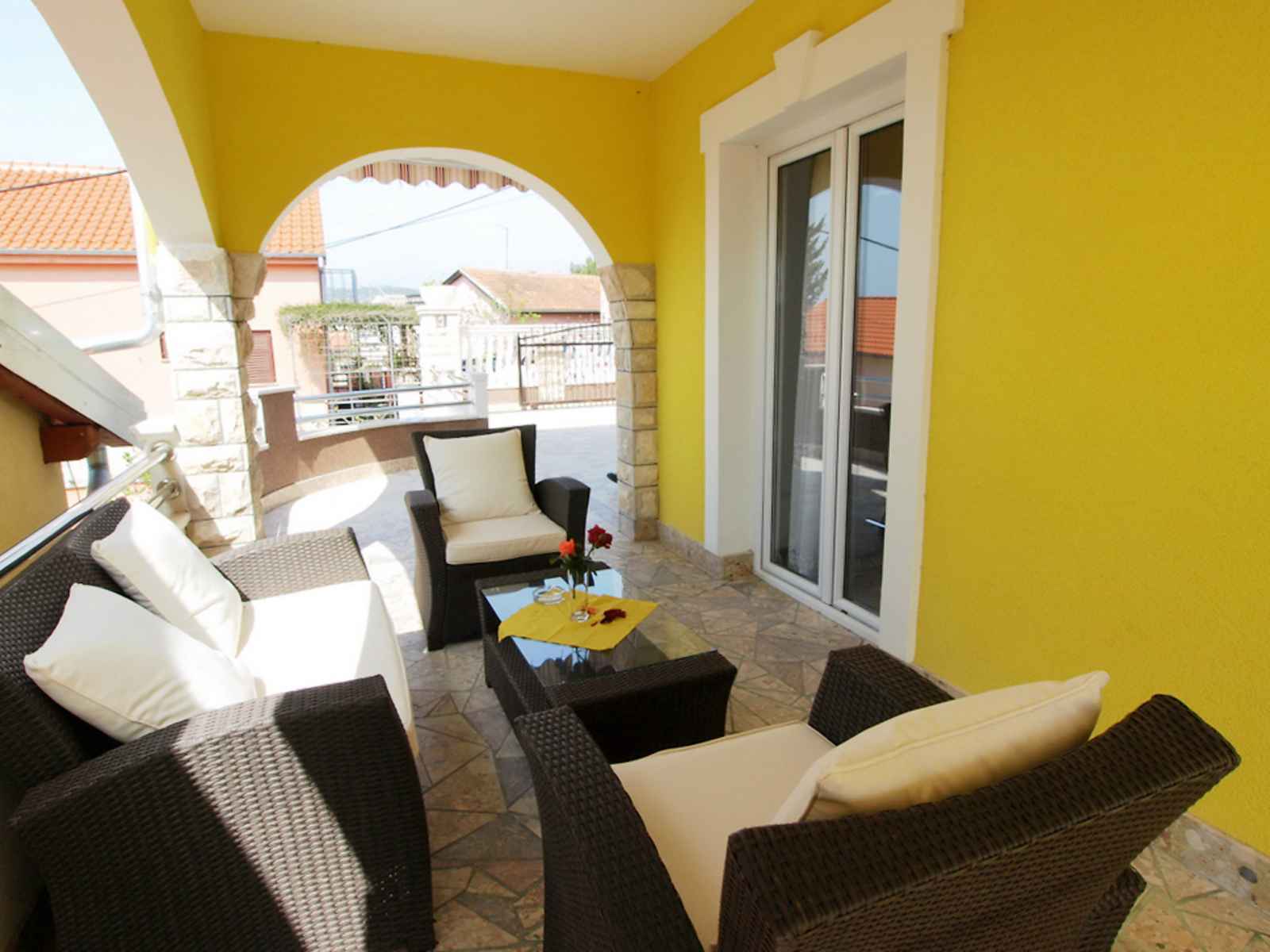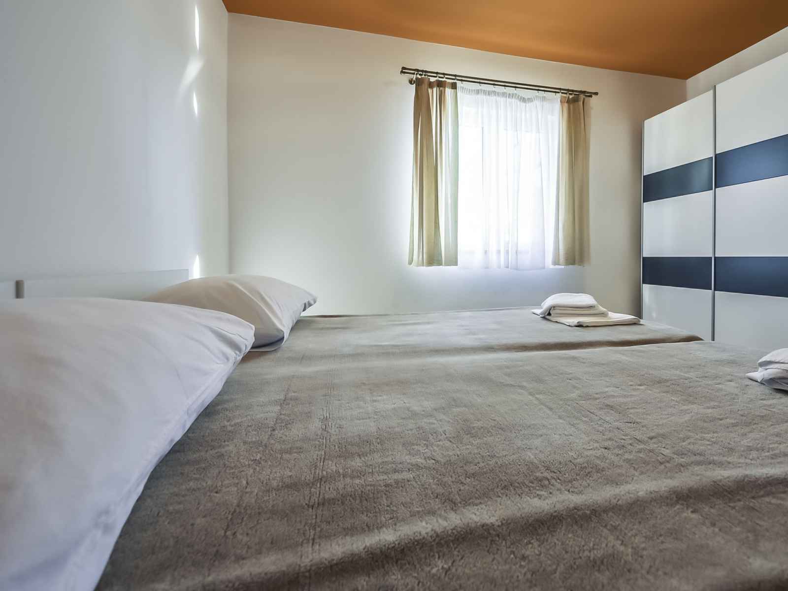 Apt 4 pièces 90 m2, au rez-de-chaussée. séjour/salle à manger avec tv (satellite) (écran plat), air-conditionné. sortie sur la terrasse. 2 chambres, chaque chambre avec: 1 lit double (2 x 80 cm, longueur 200 cm). 1 chambre avec 2 lits (80 cm, longueur 200 cm). cuisine ouverte (4 plaques de cuisson, four, lave-vaisselle, congélateur).