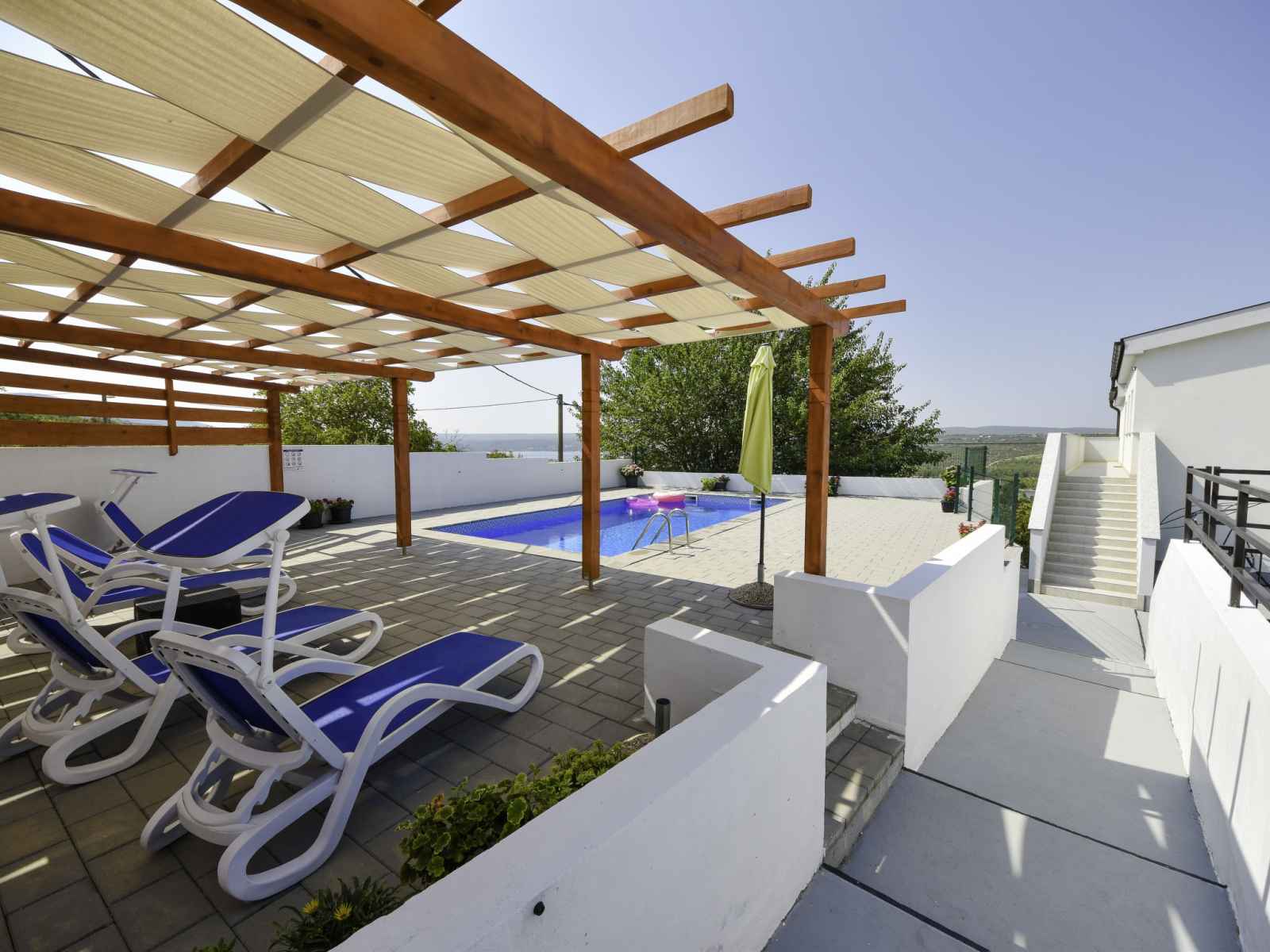 Ribnica à 15 km de novigrad: maison à 2 apts "nina". À 7 km du centre d'obrovac, situation ensoleillée, surélevée, à 900 m de la mer, à 900 m de la plage. a usage privé: terrain 300 m2 (clôturé), piscine rectangulaire (8 x 4 m, profondeur 150 cm, disponibilité saisonnière: 04.mai. - 05.oct.). meubles de jardin, barbecue.