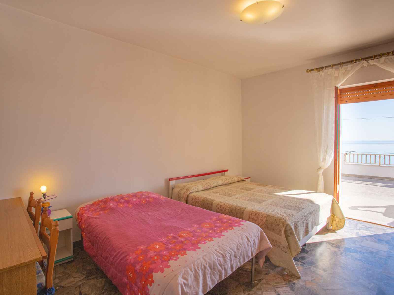 Apt 4 pièces 120 m2, à l'étage supérieur, situation ouest. aménagement simple et confortable: 1 chambre avec 1 lit et 1 lit double (160 cm). sortie sur la terrasse. 1 chambre avec 1 grand-lit (160 cm). 1 chambre avec 2 lits. cuisine/séjour (four, 4 feux, congélateur) avec table pour les repas, tv. sortie sur le balcon. bain/wc. pas de
