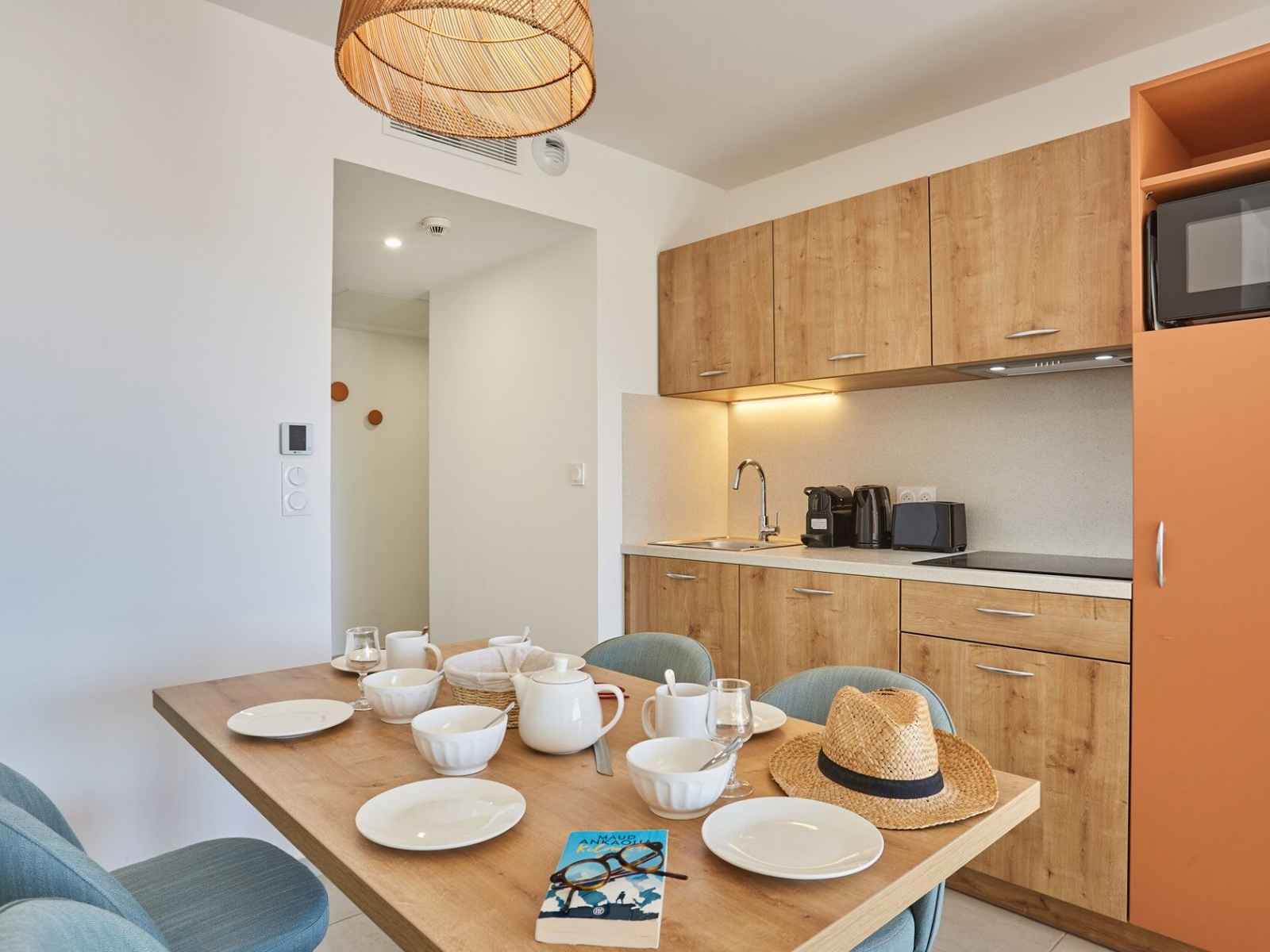 kitchenette équipée (plaques de cuisson, réfrigérateur, micro-ondes, lave-vaisselle, cafetière à capsules)