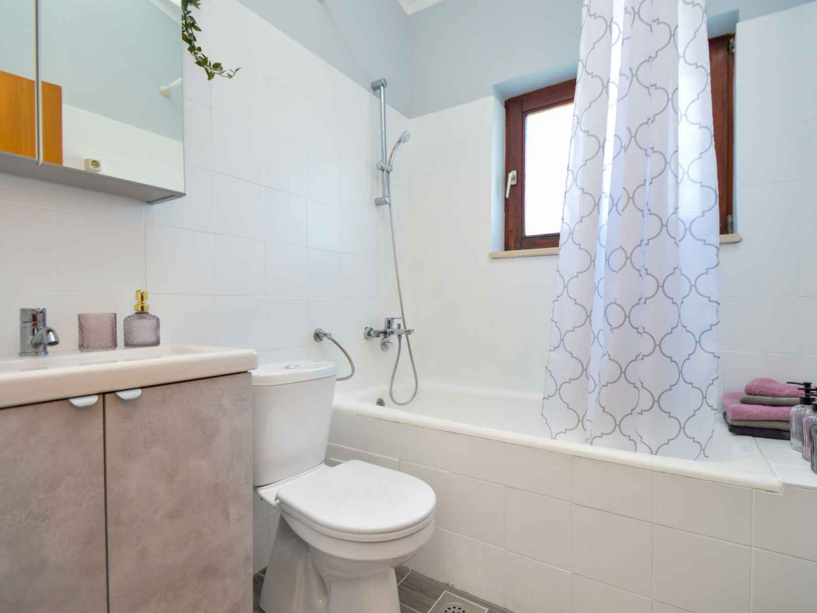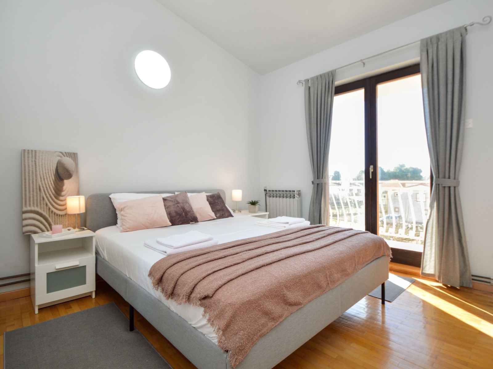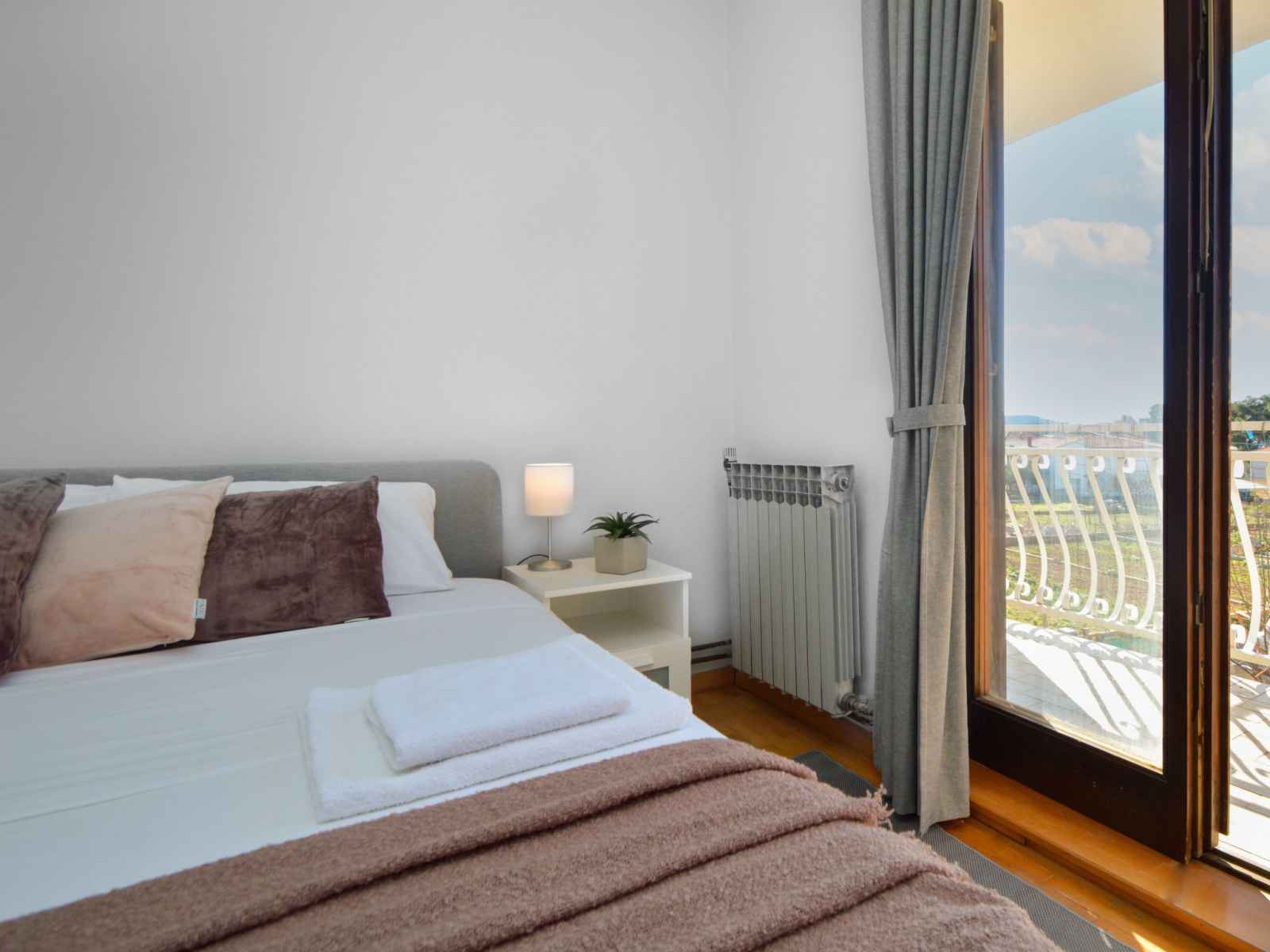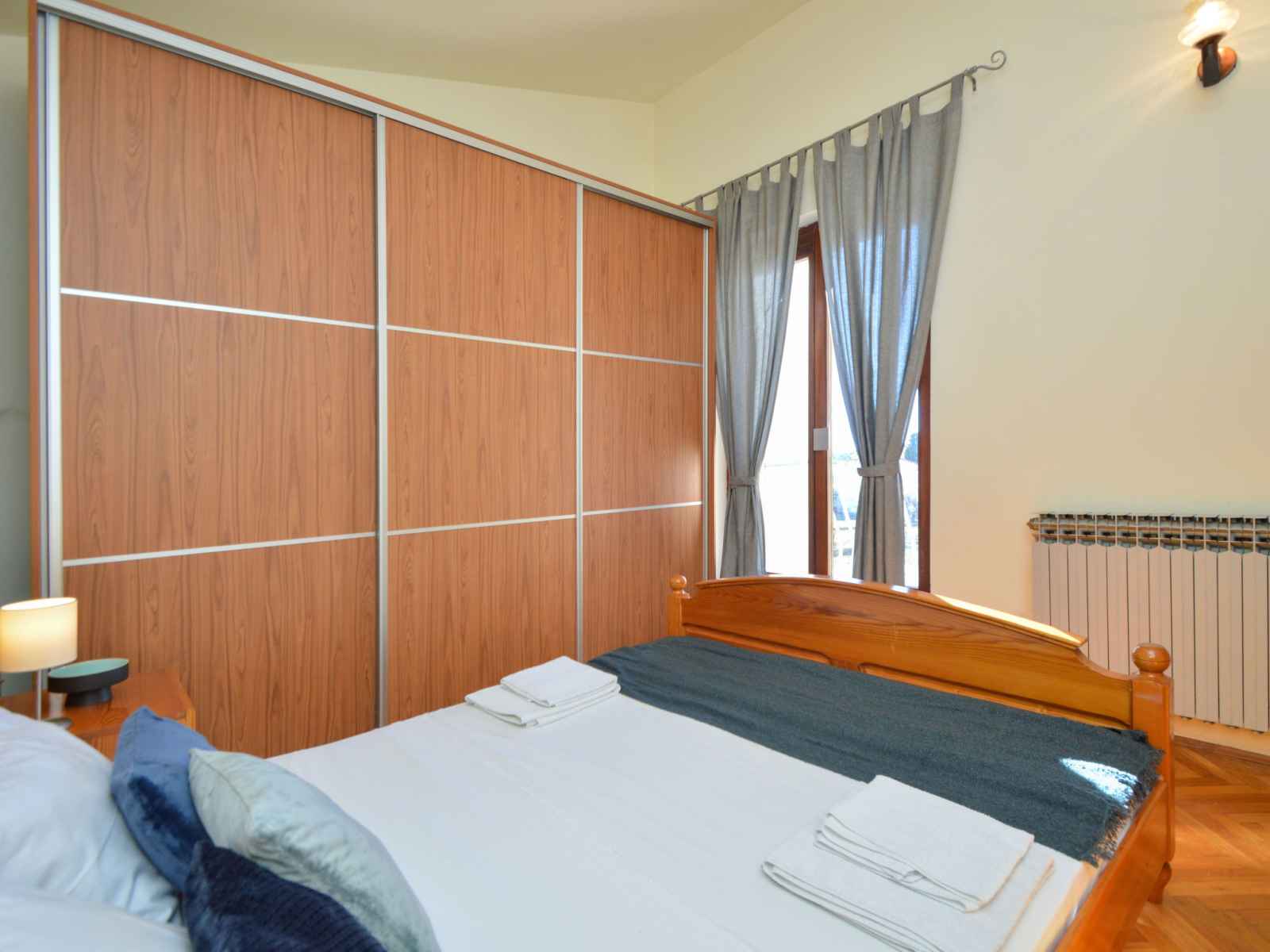 grand-lit (160 cm, longueur 200 cm), air-conditionné. Sortie sur le balcon. 1 chambre, mansardée hauteur plafond 150 - 270 cm avec 1 divan-lit (140 cm, longueur 190 cm). 2 bains/WC. Pas de chauffage. Balcon 6 m2, 2 balcons 3 m2, terrasse 20 m2 partiellement couverte. Meubles de terrasse, barbecue, chaises longues. A disposition: lave-linge, sèche-cheveux. Internet (Connexion WIFI, gratuit). Veuillez noter: entrée privée.
