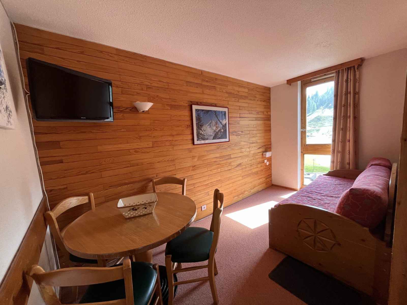il est en exposition ouest avec vue sur la vallée, au 5 ème étage avec un balcon (pas de vue sur les pistes).
