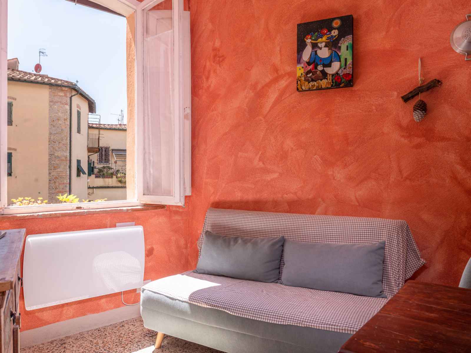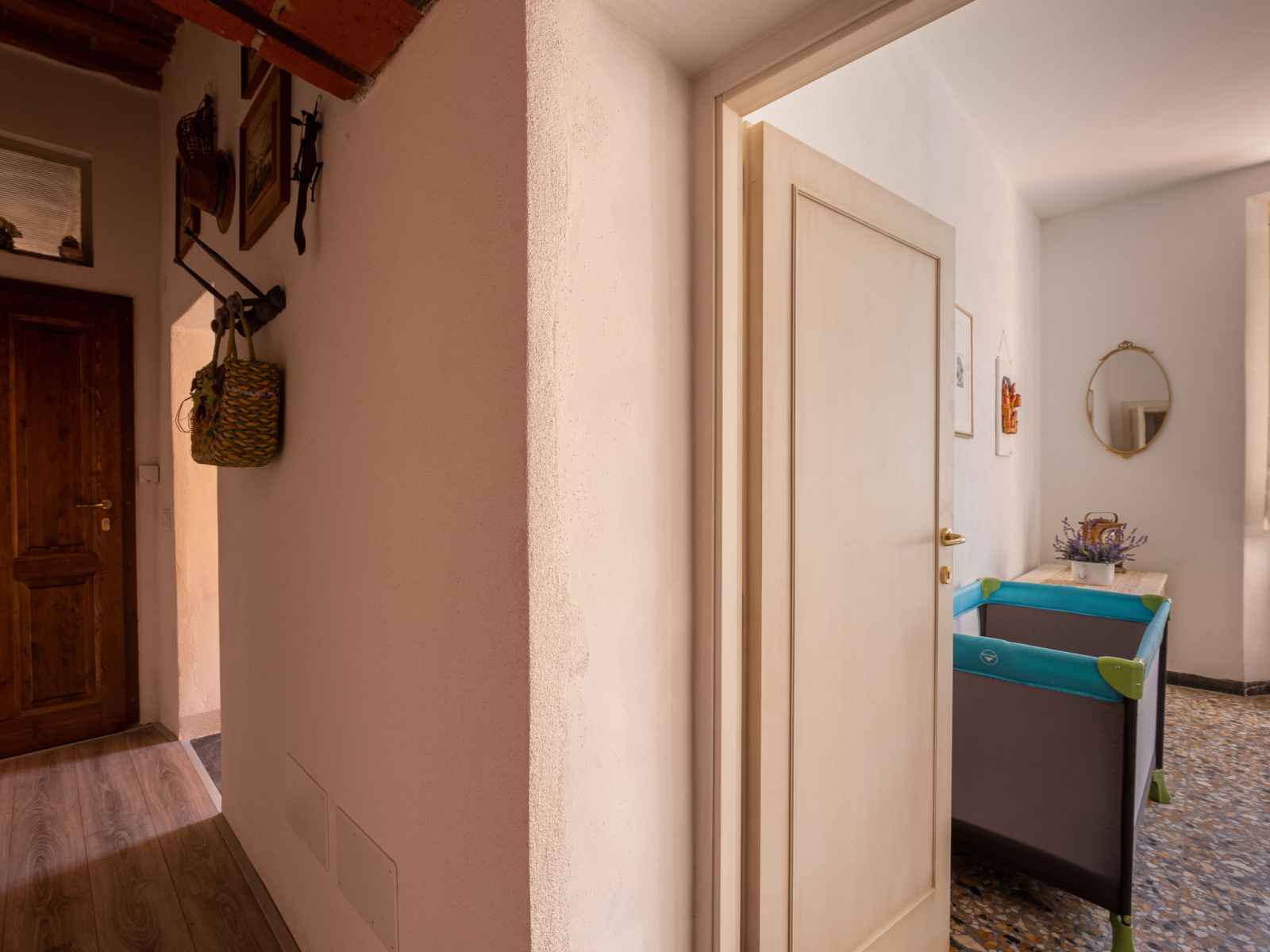 "casa dell´arco", apt 4 pièces 85 m2, au rez-de-chaussée. complètement rénové, aménagement confortable et plaisant: séjour/salle à manger avec table pour les repas et tv. sortie sur le balcon. séjour avec cheminée (uniquement à titre de décoration), table pour les repas et tv. 1 grande chambre double. chambre avec passage avec 1