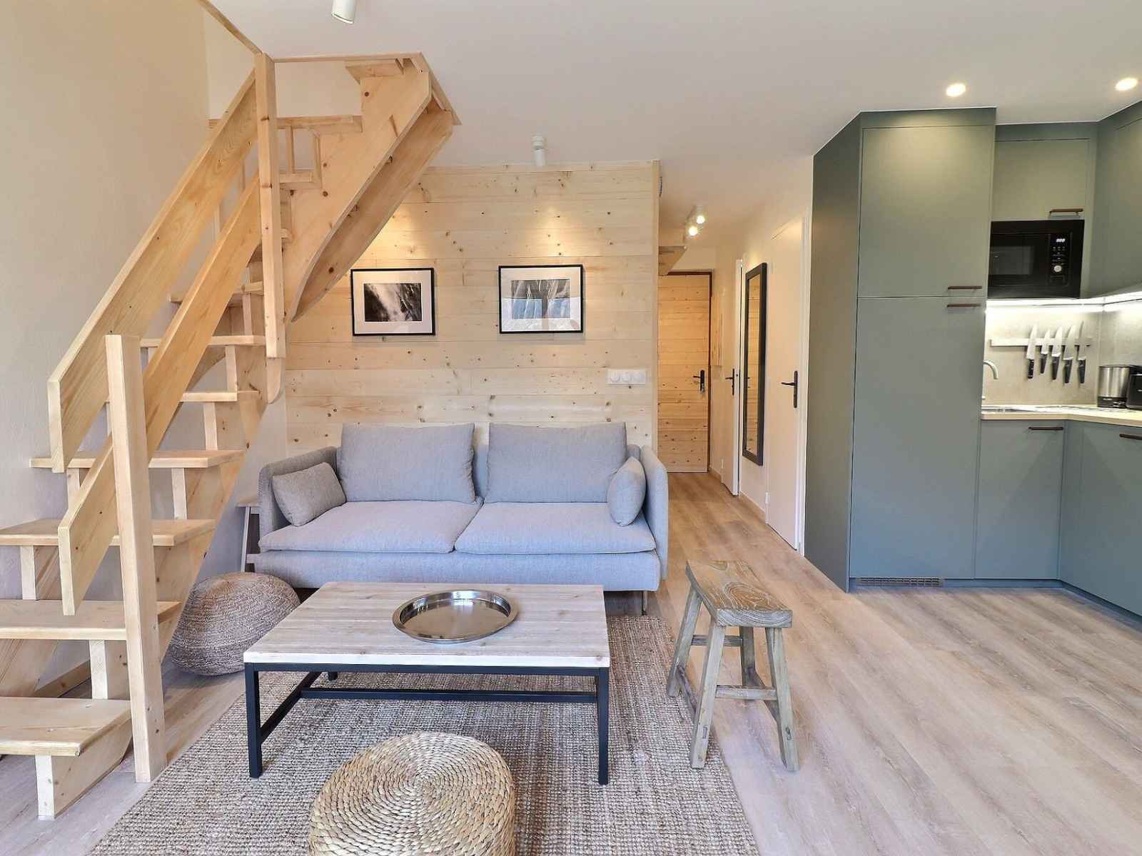 cuisine ouverte : micro-ondes, four, lave-vaisselle, frigidaire, 4 plaques induction, hotte, cafetière à filtre, grille-pain, bouilloire