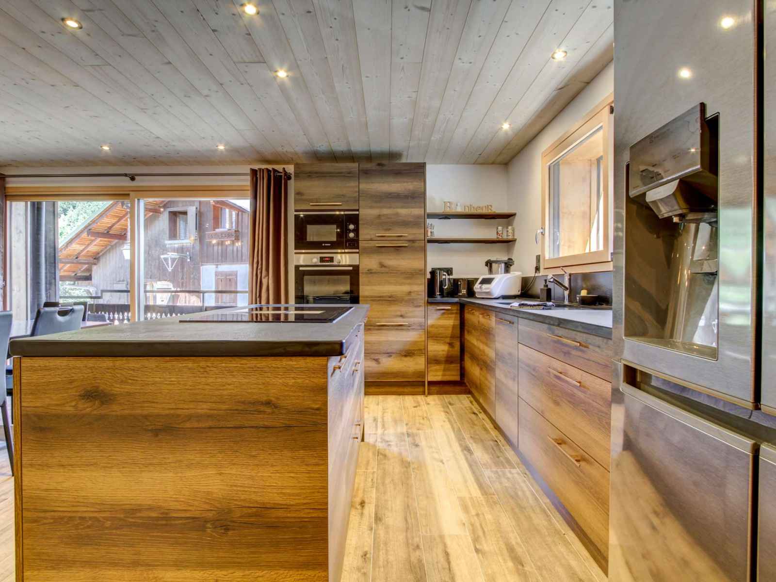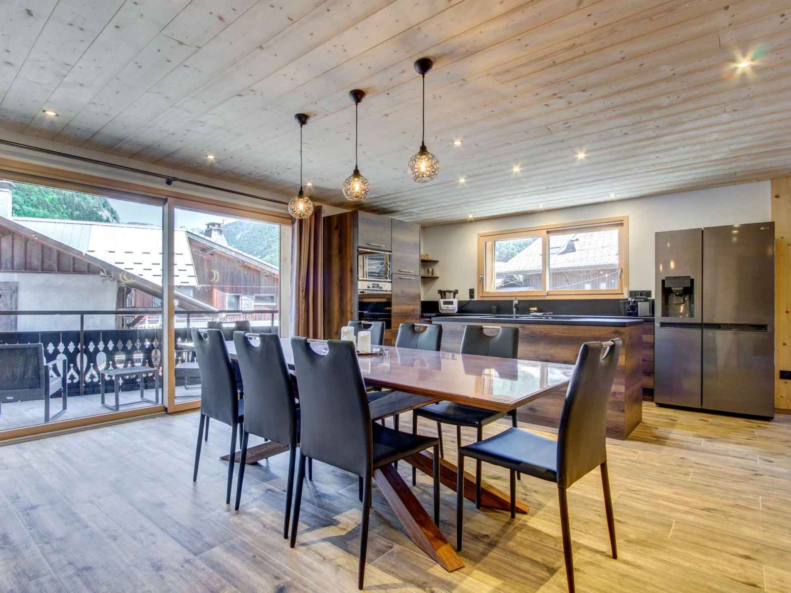 Cuisine ouverte avec coin repas et accès terrasse