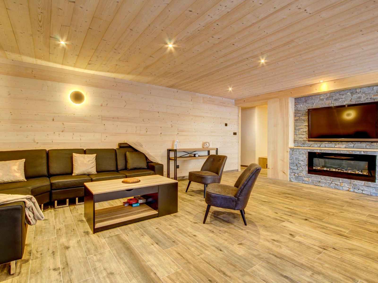 Pièce à vivre: coin salon avec cheminée décorative, télévision