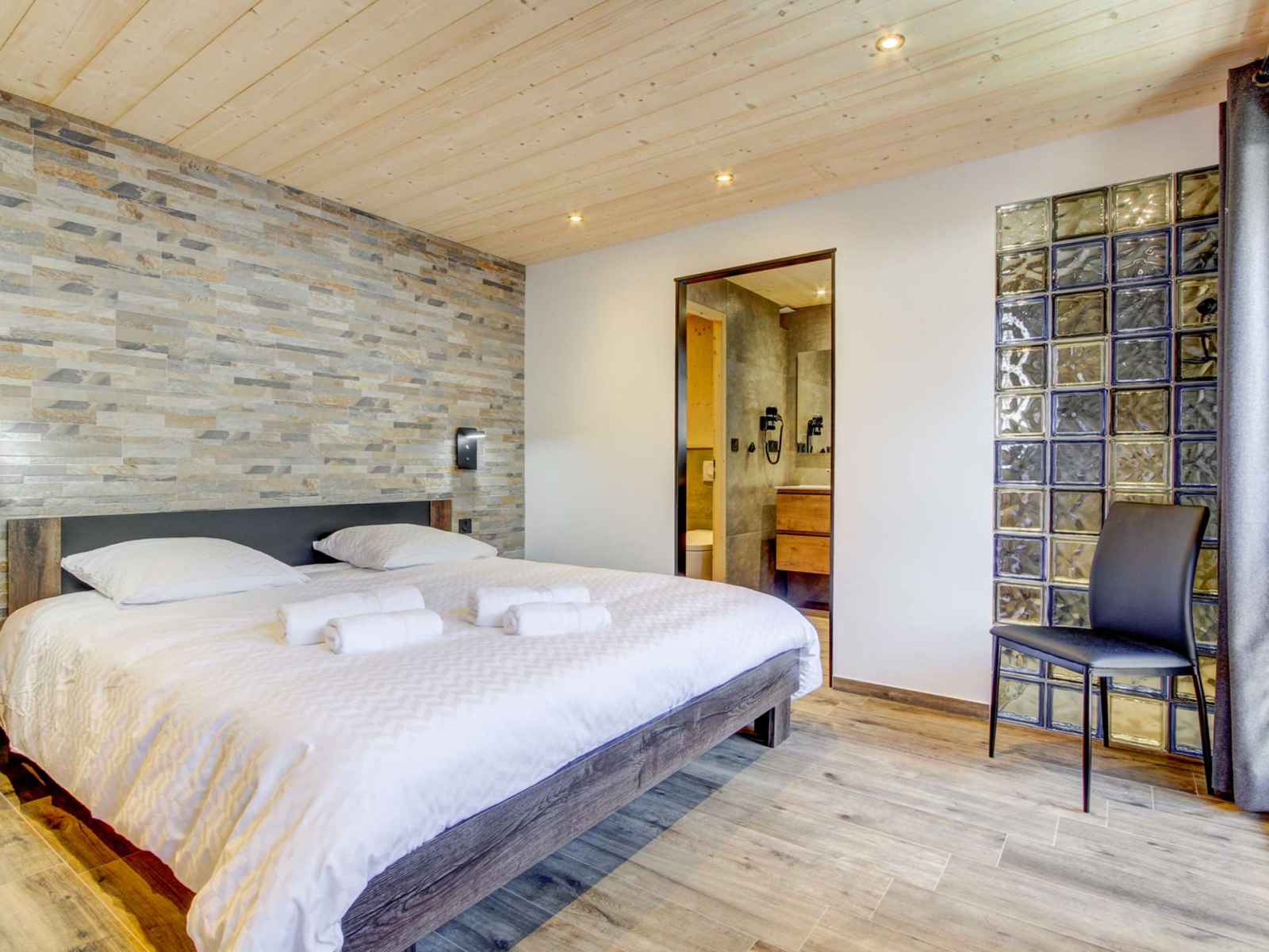 chambre 1: un lit double (160x200), télévision, accès balcon + dégagement : coin