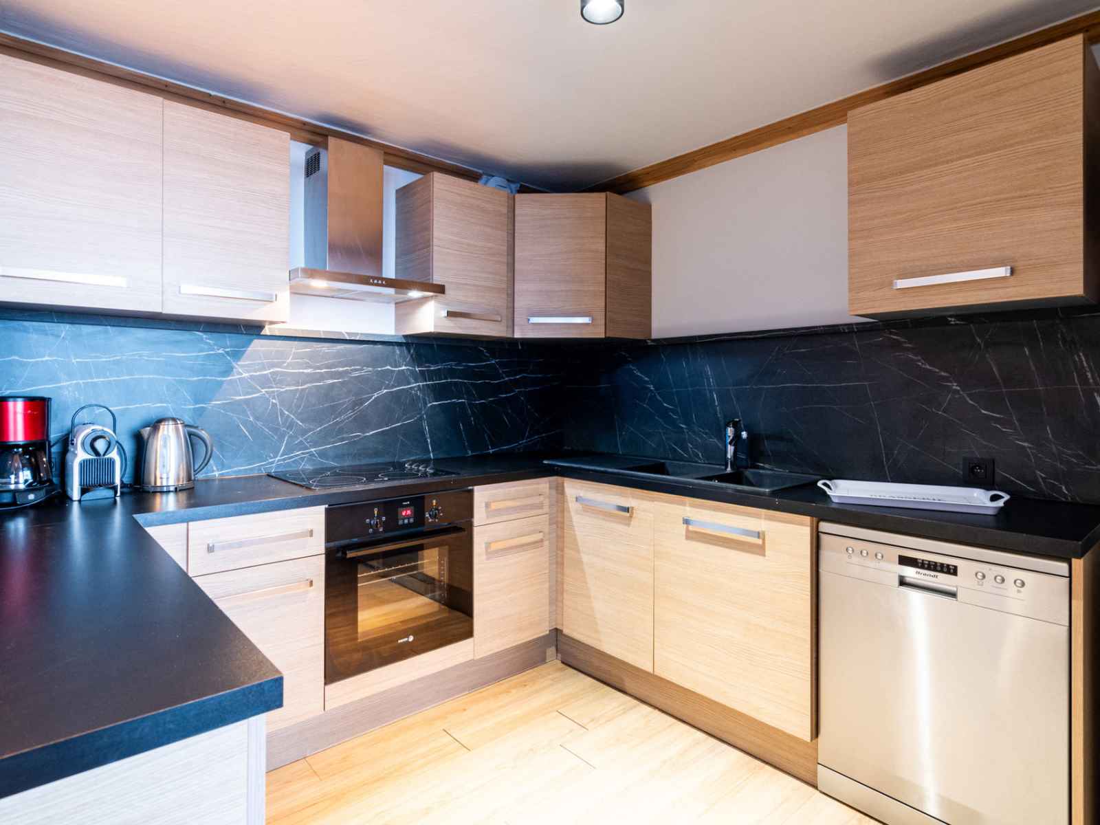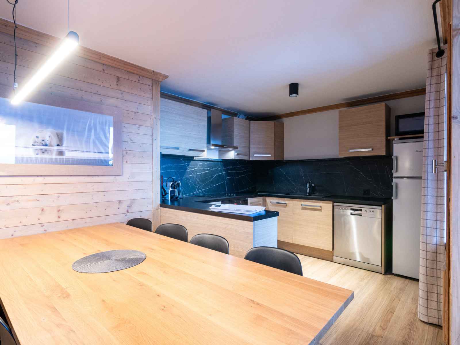 cuisine : réfrigérateur/congélateur, plaques vitrocéramiques, hotte, four, micro-ondes, cafetière nespresso