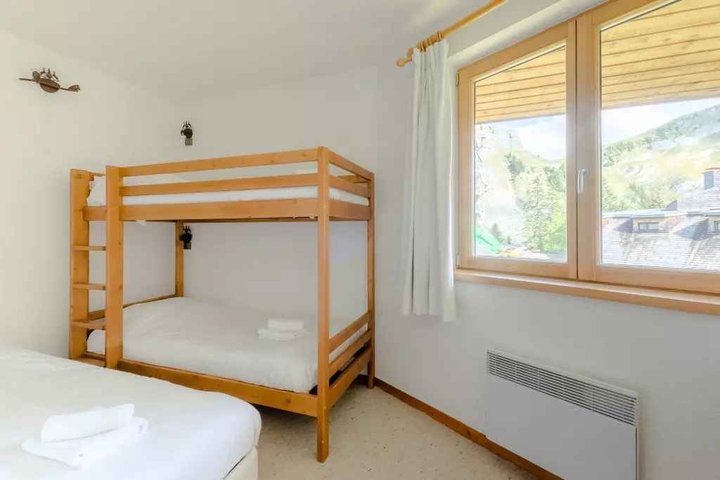 Au niveau -1 : 2 chambres avec 2 lits doubles dont 1 avec accès au balcon. 1 chambre avec 1 lit superposé (2 couchages) et 1 lit simple.