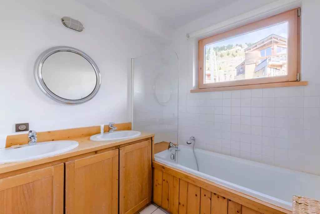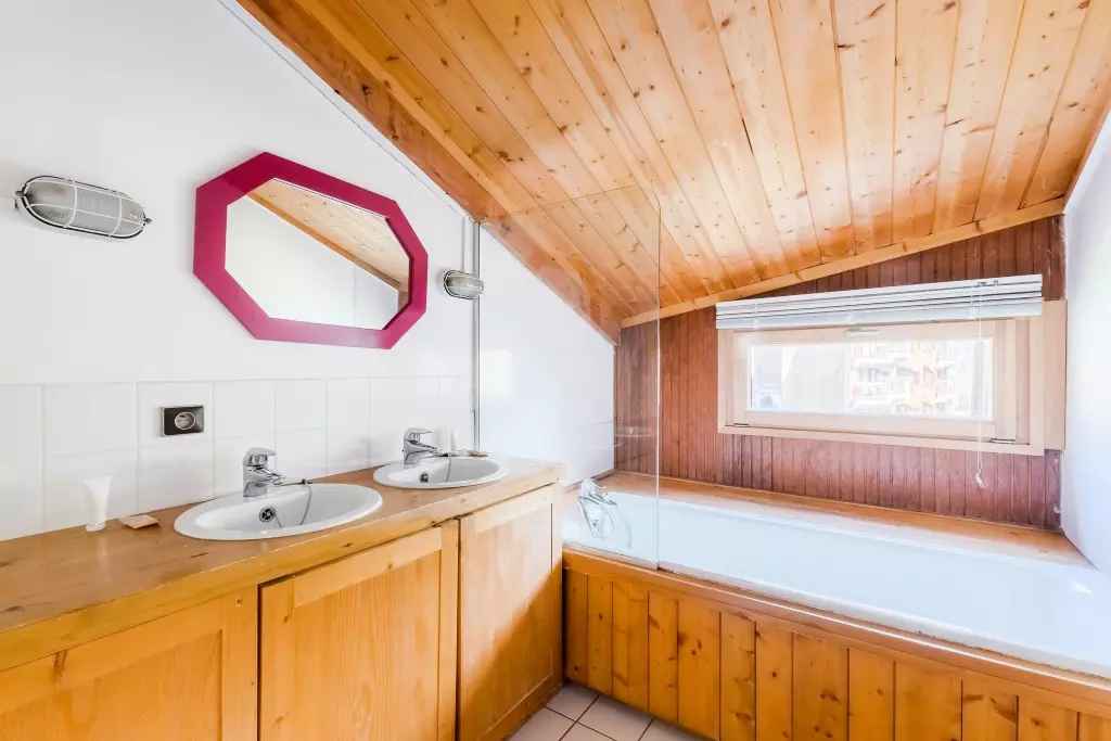 A l’étage : 1 salle de bains avec baignoire et porte-serviettes chauffant. 1 WC séparés