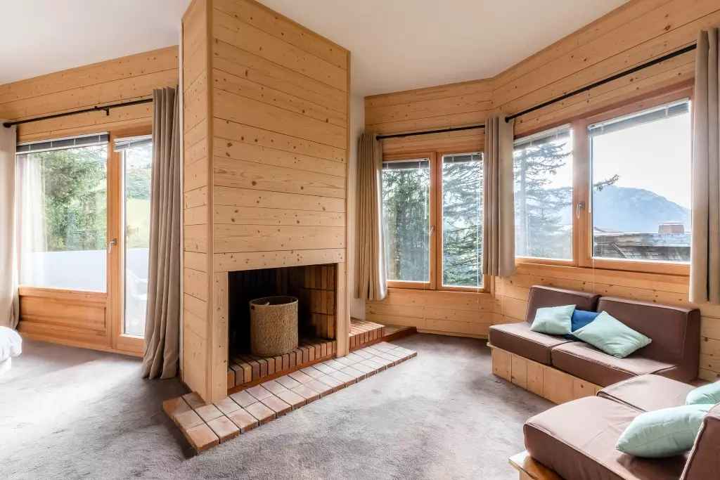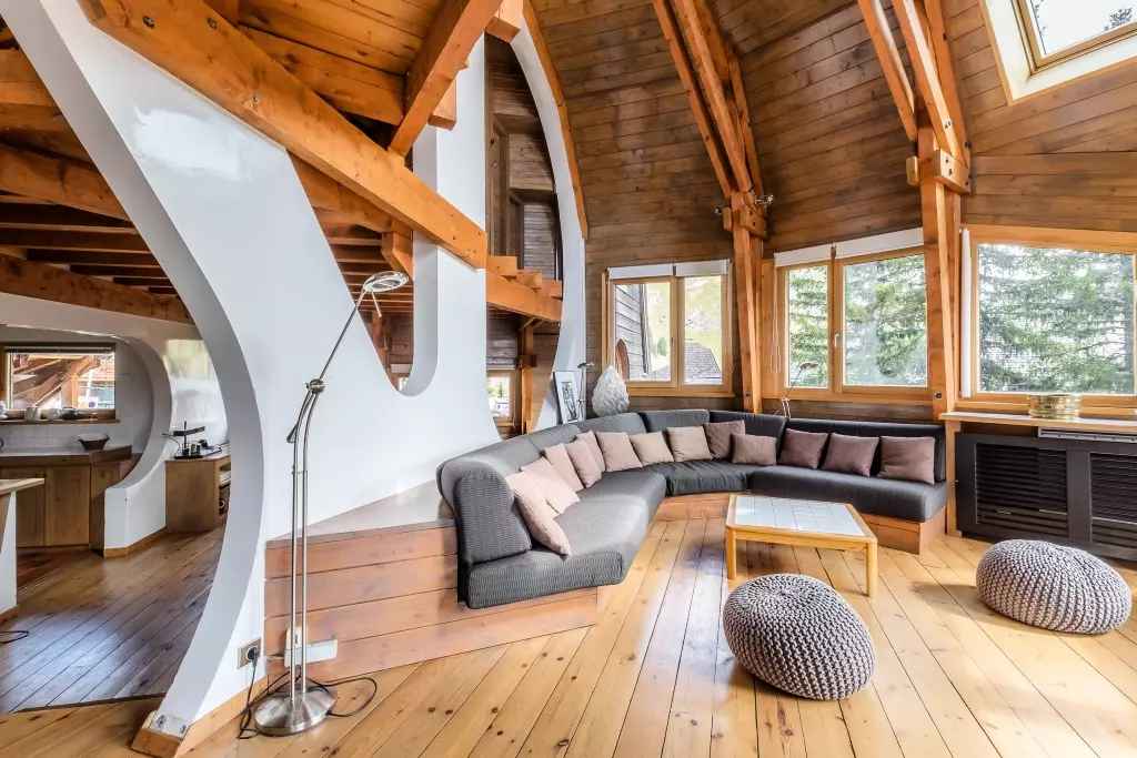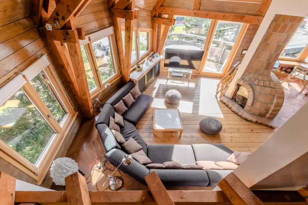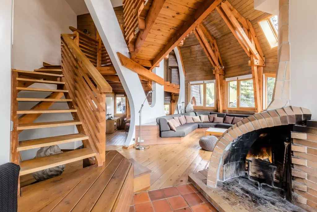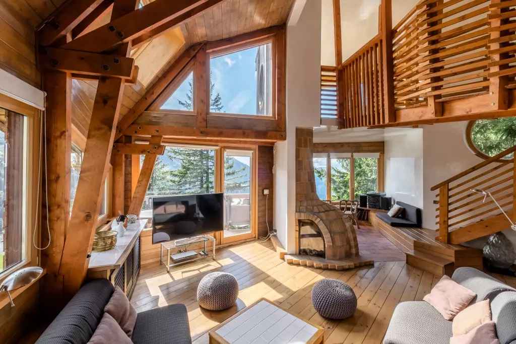 la cheminée instaure une ambiance cosy et chaleureuse dans le vaste séjour à la décoration typiquement savoyarde. grâce aux nombreuses