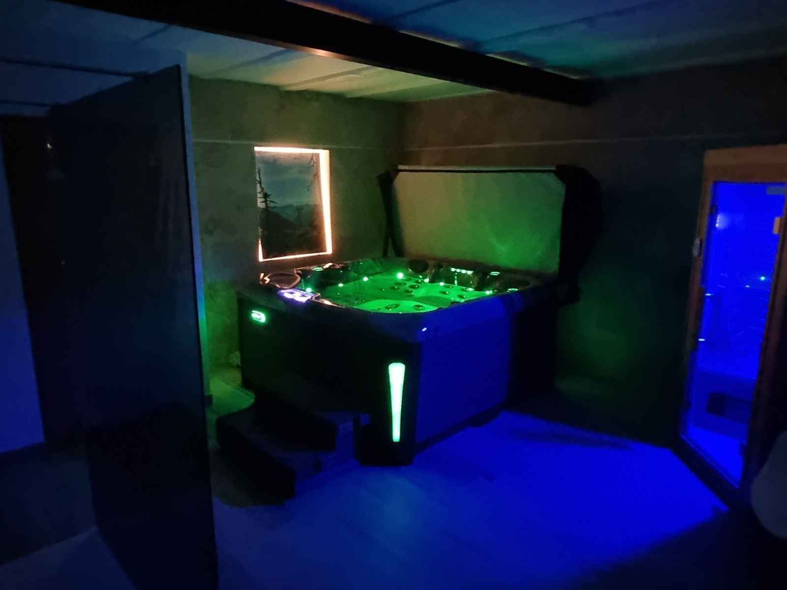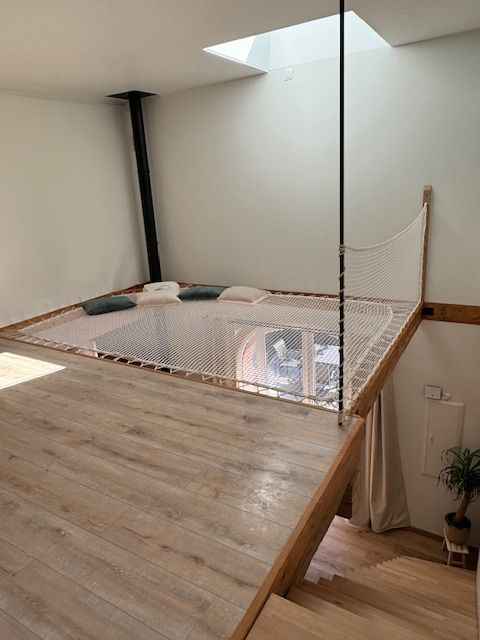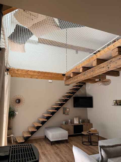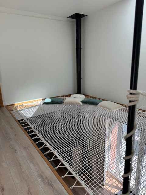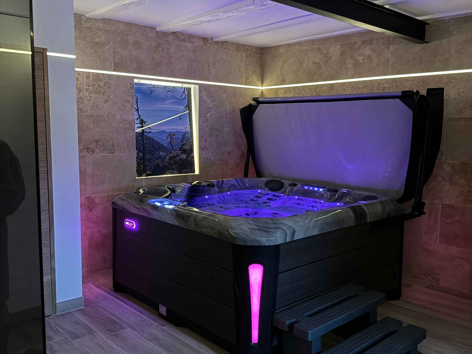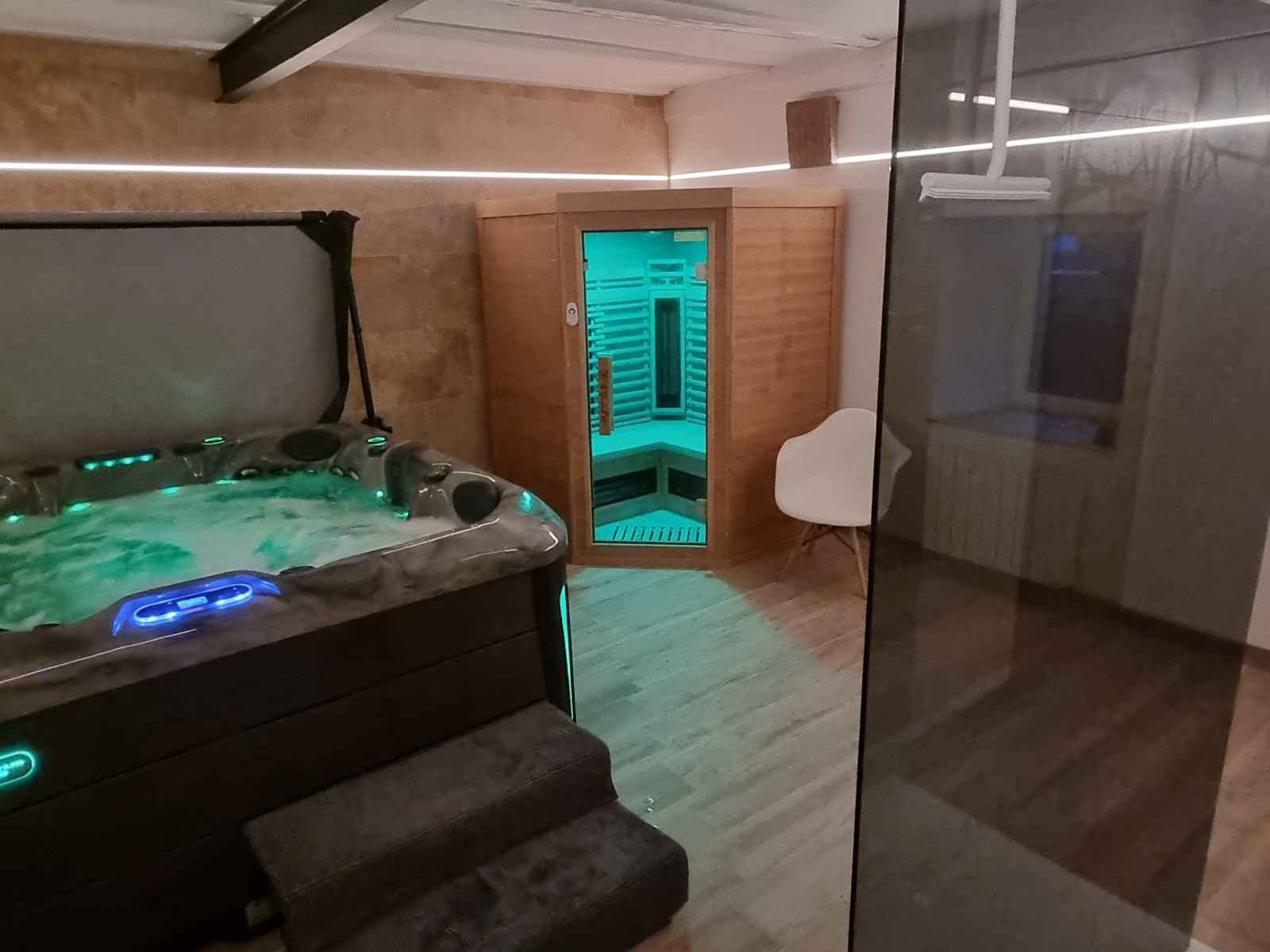 écran plat connecté avec smart TV (Netflix (accès à un compte gratuitement), YouTube...), d'un canapé convertible 140x190cm et des jeux de société sont à votre disposition. La cuisine est ouverte sur le salon et est entièrement équipée avec tout le nécessaire : micro-ondes, four, réfrigérateur 140L, plaque à induction 3 foyers, lave-vaisselle, grille-pain, bouilloire, machine à café expresso, mixeur à soupe, batteur, appareil à raclette, appareil à fondu et tout le nécessaire à vaisselle. Également quelques aromates pour agrémenter par une petite touche perso à votre cuisine faites sur place si besoin. Vous avez également accès par la pièce de vie à l'espace bien être privatif avec un jacuzzi spacieux 5 places un sauna infrarouge, et une douche à l'italienne situé à côté . Les peignoirs et les serviettes sont à votre disposition gratuitement. Cet espace est en accès libre et est exclusivement réservée pour vous pendant votre séjour. A l'étage, une chambre très spacieuse en mezzanine de 22m2 avec un lit de 180x200cm et donnant sur un filet suspendu où vous pourrez vous y détendre. Relaxation détente . Un grand dressing avec machine à laver et nécessaire de repassage sont disponibles dans le logement. Vous trouverez également un WC indépendant et une salle d'eau avec douche à l'italienne 140x90, un sèche cheveux et un lisseur, les serviettes sont fournis. Un espace extérieur clôturé privatif de 25m2 composé d'une table avec chaises, un parasol, 2 relax, barbecue, idéal pour manger et vous détendre en toute intimité. Pour la saison d’été Pour vos loisirs, 2 VTT sont à disposition ainsi que des raquettes à neige. Un garage fermé est à également à votre disposition pour vos 2 roues si besoin. Entrée de l'hébergement de plain pied, chambre, salle d'eau et WC à l'étage. Arrivée dans le logement est à partir de 17h00