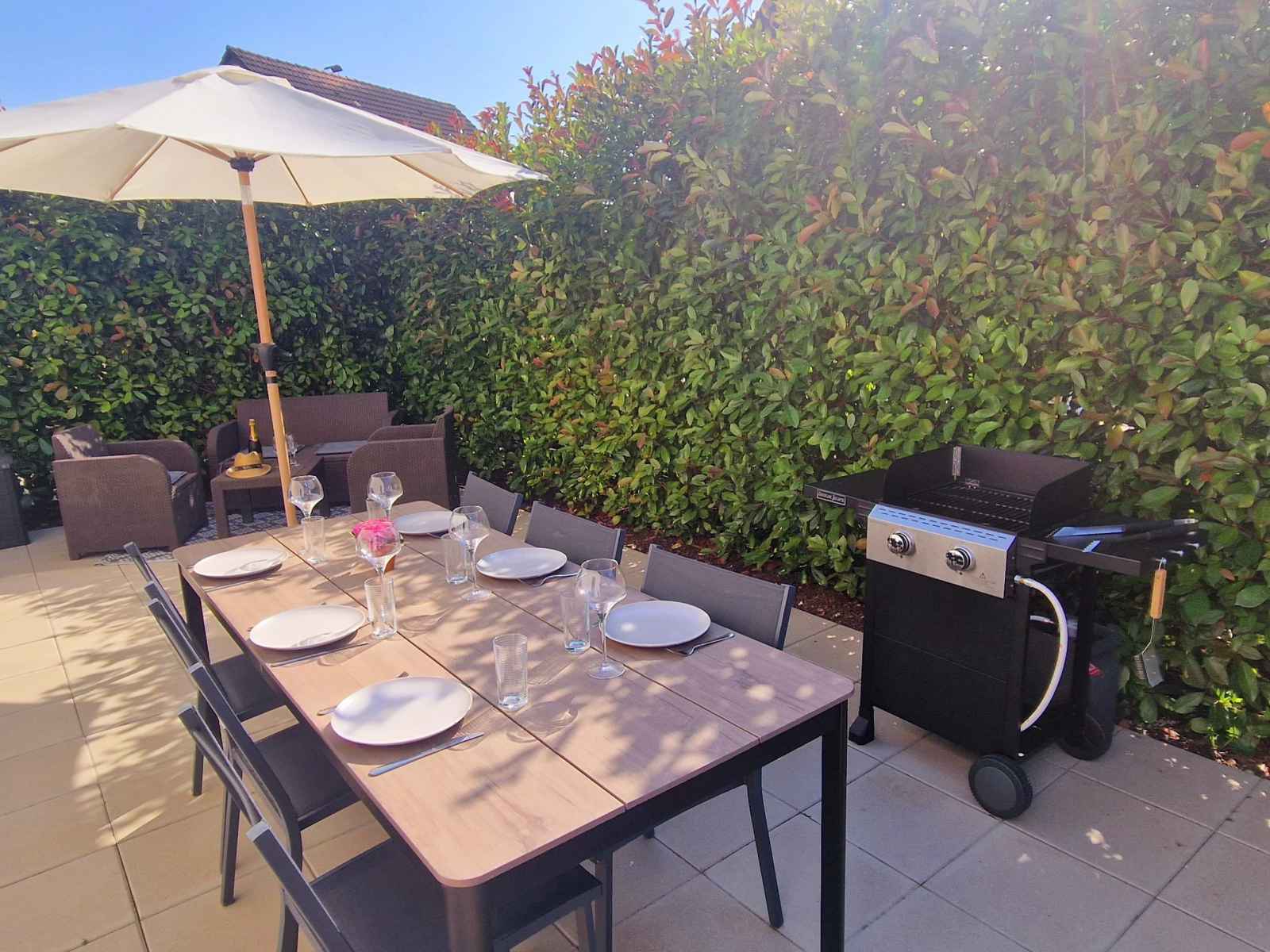 linge. A l'étage : 3 chambres (2 chambres avec un lit double de 160cmx200cm et 1 chambre avec 2 lits simples), une grande salle de bain avec une douche, baignoire, wc et lavabo,. Terrasse sans vis à vis avec un espace salon de jardin, une table avec 6 chaises et un barbecue à gaz. Notre logement est ouvert toute l année. Accès par une petite marche