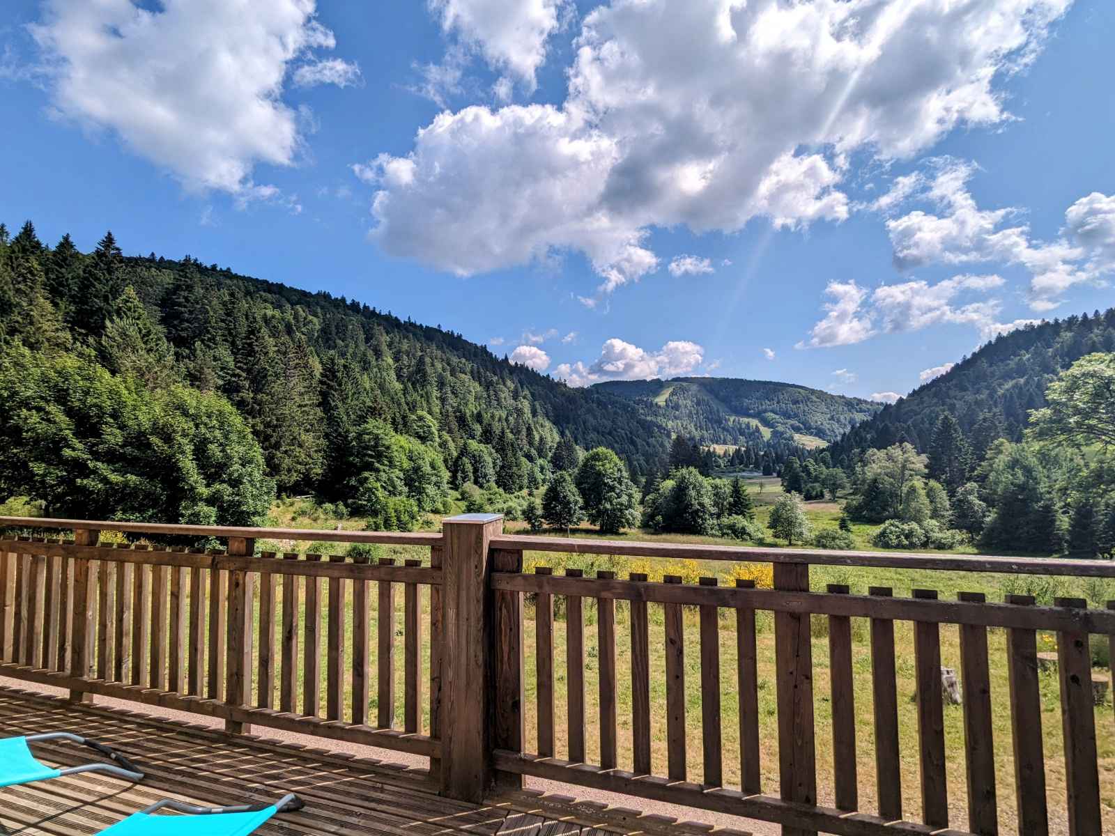 beau gîte avec une terrasse de 32 m² avec table, chaises et salon de jardin. la vue sur la vallée est