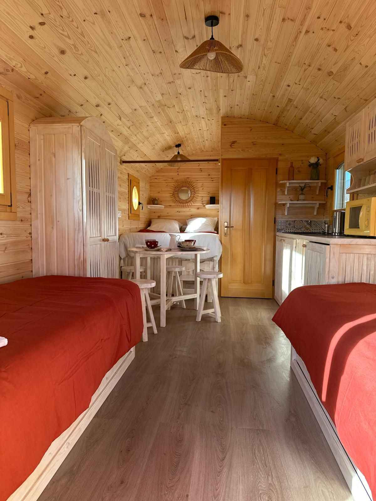 emblématiques comme le Château de Valençay, le ZooParc de Beauval, et le Parc Naturel de la Brenne pour des randonnées en pleine nature. Située à une courte distance des Châteaux de la Loire, cette roulotte est l'endroit parfait pour se détendre et explorer la richesse culturelle et naturelle de la région. La roulotte de Florette, faite à la main en bois d'épicéa, offre un hébergement original de 19,5 m² pour 4 personnes. Elle comprend 1 lit double (140 x 190 cm) en alcôve et 2 lits simples (80 x 190 cm). À l'intérieur, une kitchenette équipée, une table avec 4 tabourets, ainsi qu'une salle de bain avec douche, lavabo, WC, sèche-serviettes et sèche-cheveux sont à disposition. Plusieurs rangements sont prévus sous les lits et dans une armoire. À l'extérieur, une terrasse de 6 m² exposée au sud, avec table et chaises, est disponible. La roulotte est situé sur un domaine où se situe des chambres d'hôtes. Les équipements partagés incluent un salon lounge, une salle de dégustation, une terrasse et une piscine chauffée (juin à août, selon météo). Un terrain de pétanque et un espace séminaire de 30 m², équipé pour 10 à 12 personnes avec écran plat, webcam, Wi-Fi et autres connexions, sont aussi à disposition. La table d'hôtes est disponible sur réservation 24h à l'avance auprès des propriétaires. Le linge de toilette est en option à 3,50€ / personne et par séjour. Possibilité de réserver des petits-déjeuners à 8,50€ par personne.