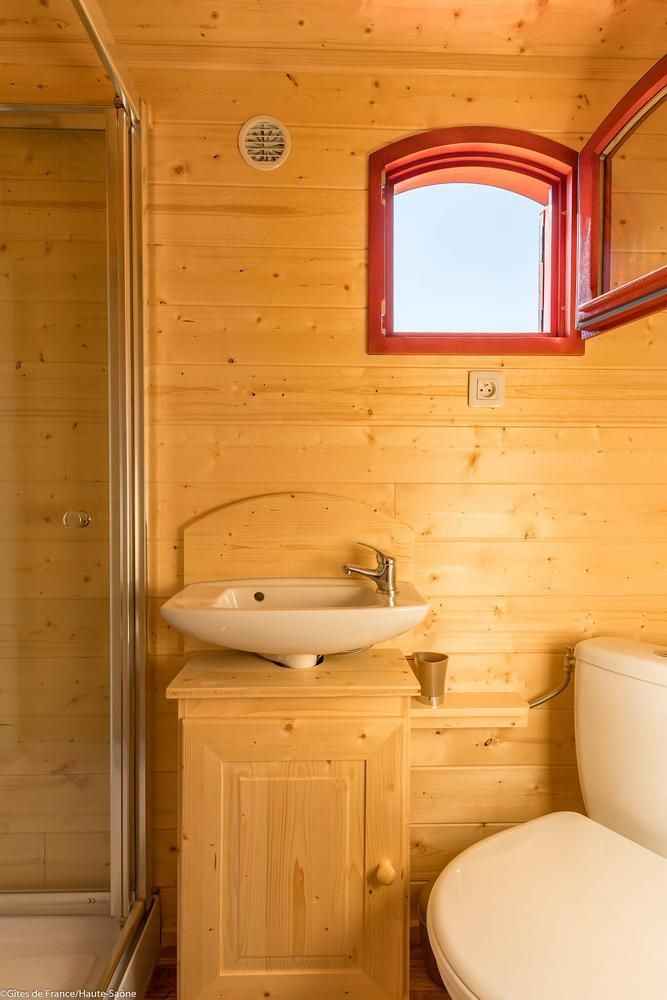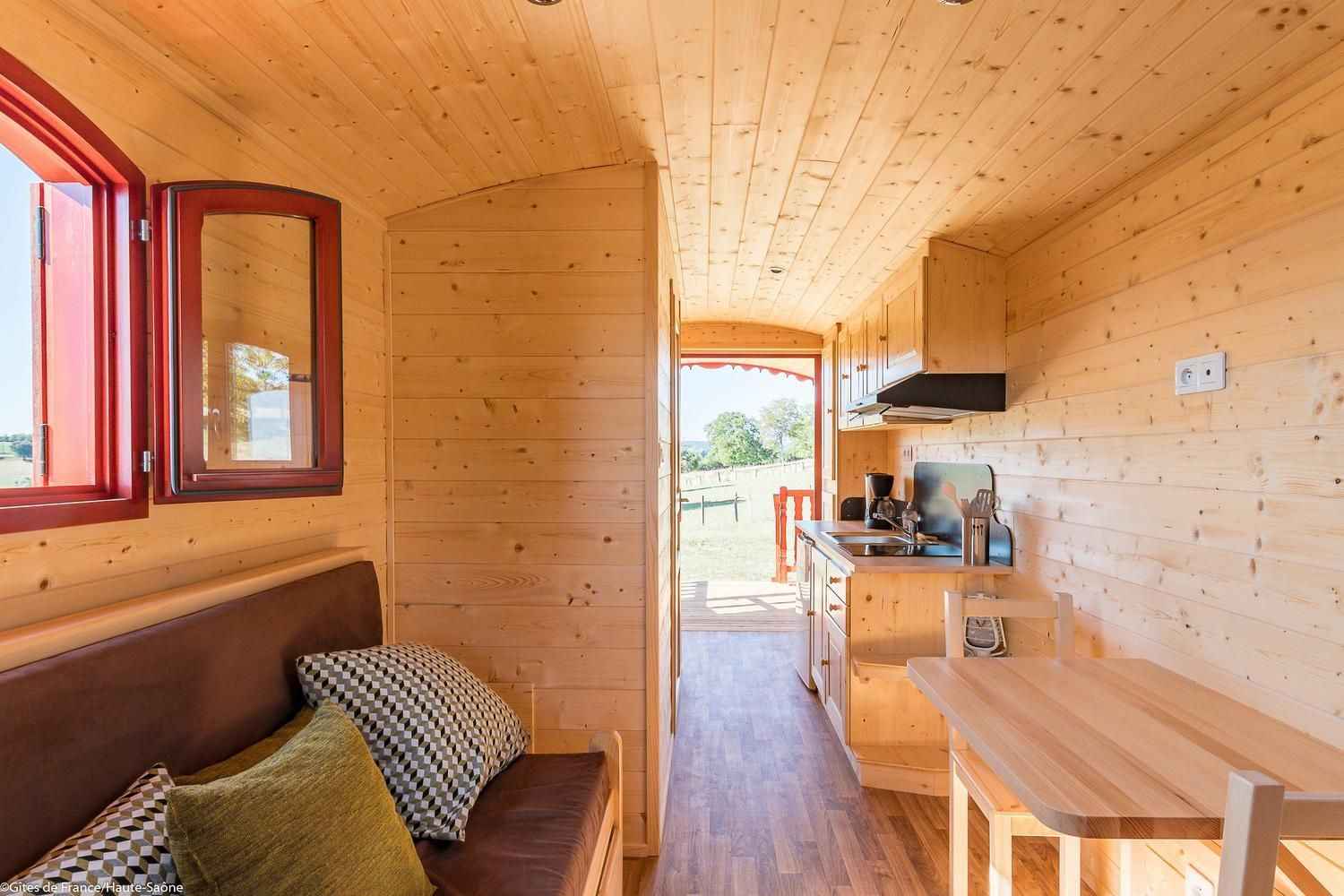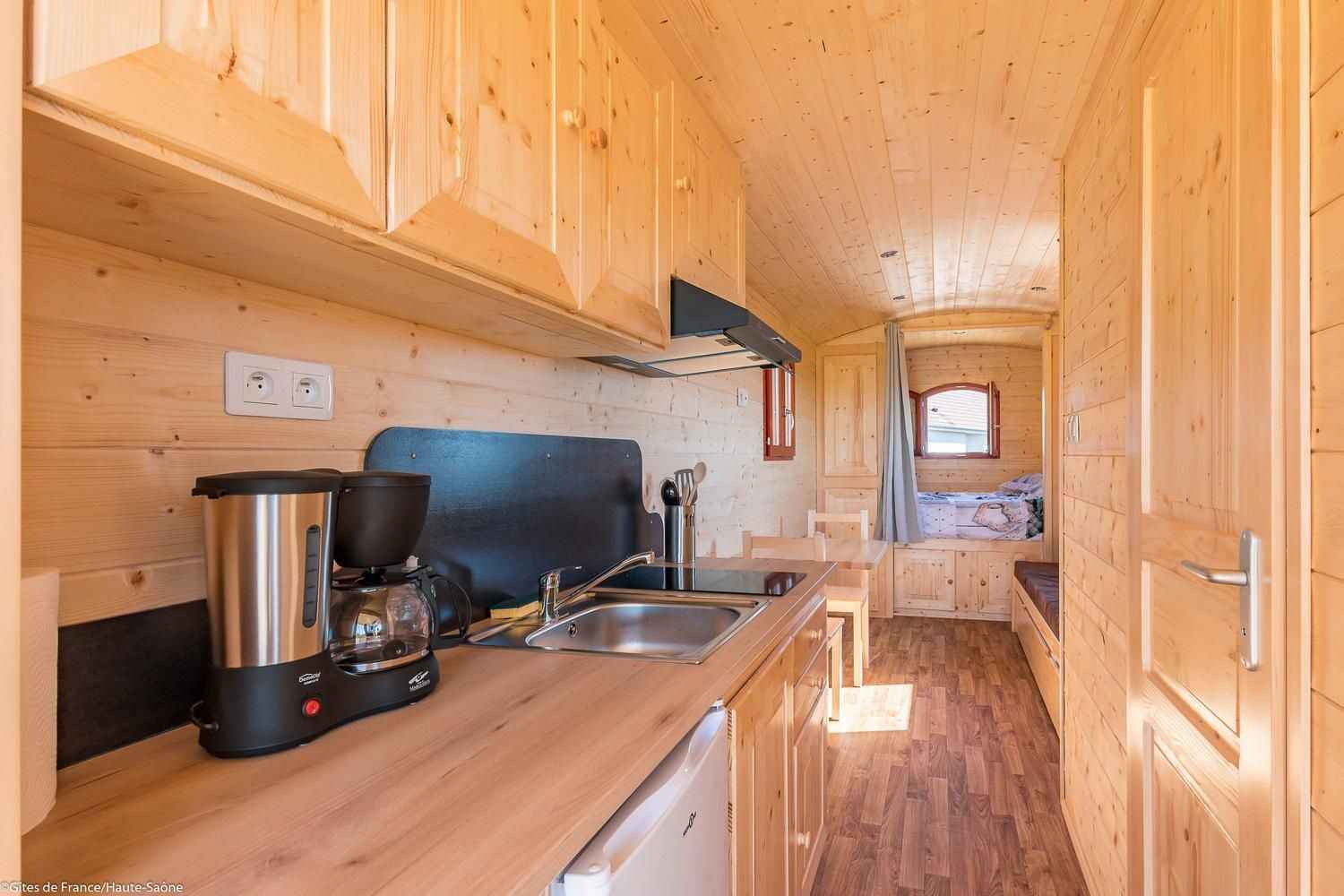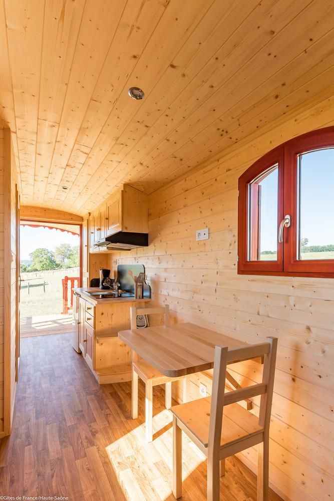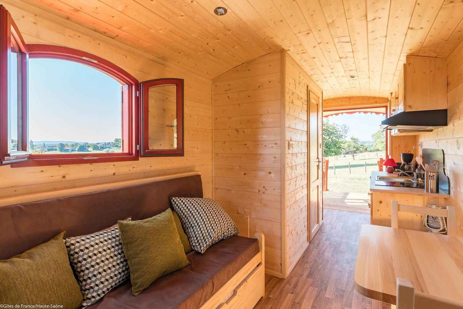 Scey-sur-Saône. A 5 km, en été : piscine découverte avec toboggans, espace ludique, bains à bulles. On se sent tellement bien ici ! Un petit coin de paradis dans cette jolie roulotte Comtoise. Depuis la terrasse couverte en bois, régalez-vous par la vue, le calme. La roulotte comprend : terrasse avec escalier (4 marches), espace cuisine, un canapé lit gigogne (2 lits en 80/190), un espace nuit en alcôve (avec 1 lit 2 personnes en 140/190). Salle d'eau avec douche et WC. Mise à disposition d'une cabane en bois de forme atypique (non chauffée), proposant un lit double (140/190) pour les personnes logeant dans la roulotte. Piscine de 4 X 7 m, chauffée et sécurisée, ouverte du 1er mai au 30 septembre (selon météo), à partager avec les propriétaires et les locataires du gîte situé sur la propriété. Terrain de pétanque, table de ping-pong, panier de basket. Salon de jardin et barbecue. Draps fournis. Charges comprises. Chauffage électrique. Internet WiFi. La roulotte peut également être louée avec le gîte, pour un total de 8 personnes (contacter la propriétaire). Fermé du 1er septembre au 28 février Les clefs vous seront remises sur place par les propriétaires, nous vous invitons à les contacter avant votre arrivée.