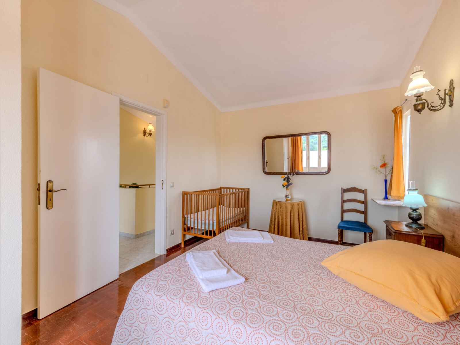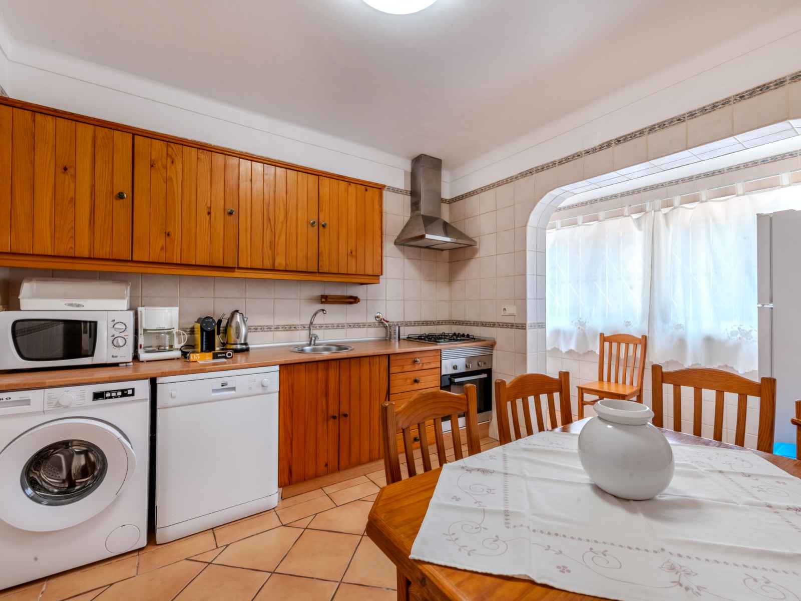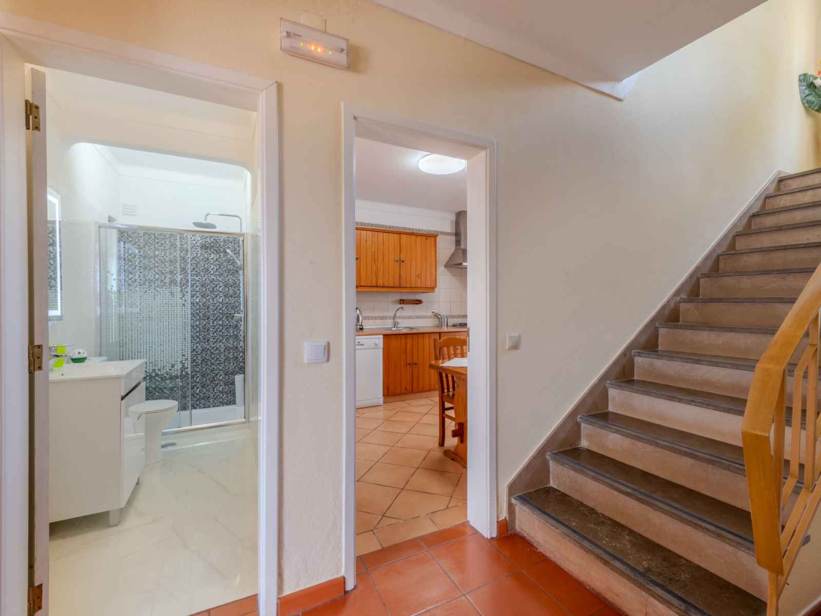 lave-vaisselle, 4 feux, grille-pain, bouilloire électrique, micro-ondes, congélateur, cafetière électrique) avec table pour les repas. Sortie sur le jardin. Douche/WC. À l'étage supérieur: 1 chambre avec 1 grand-lit (140 cm, longueur 200 cm), air-conditionné. Sortie sur la terrasse. 1 chambre avec 2 lits (90 cm, longueur 200 cm), air-conditionné. Sortie sur la terrasse. Douche/WC. Chauffage électrique. Chauffage pas dans toutes les pièces. Sol en parquet. Terrasse couverte. Meubles de terrasse, barbecue, chaises longues (6). A disposition: lave-linge, coffre-fort, fer à repasser, chaise haute pour enfant, lit bébé, sèche-cheveux. Internet (Connexion WIFI, gratuit). Veuillez noter: logement non-fumeur. Détecteur de fumée, extincteur. 42696/AL