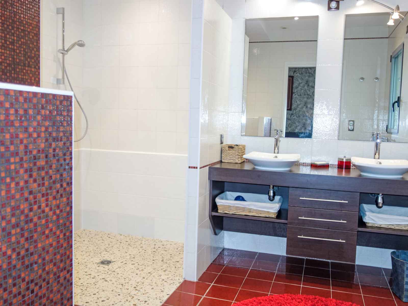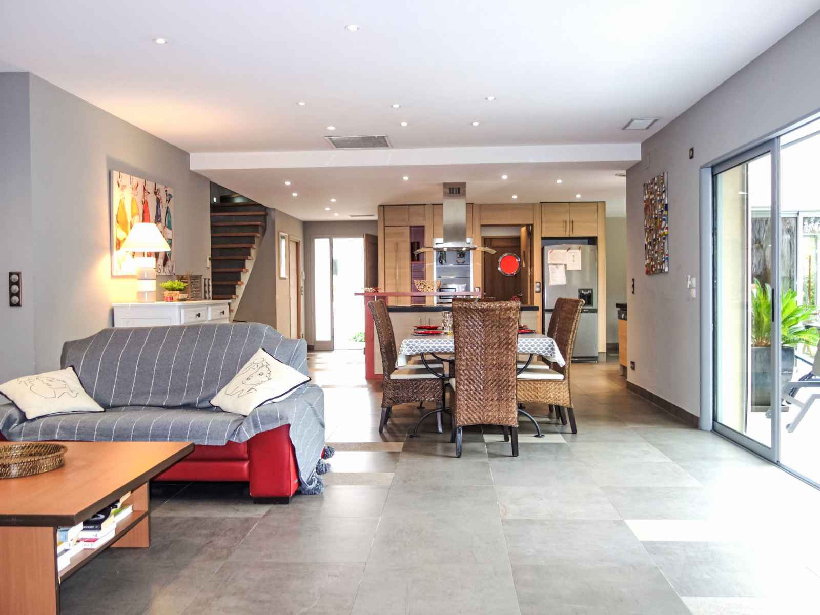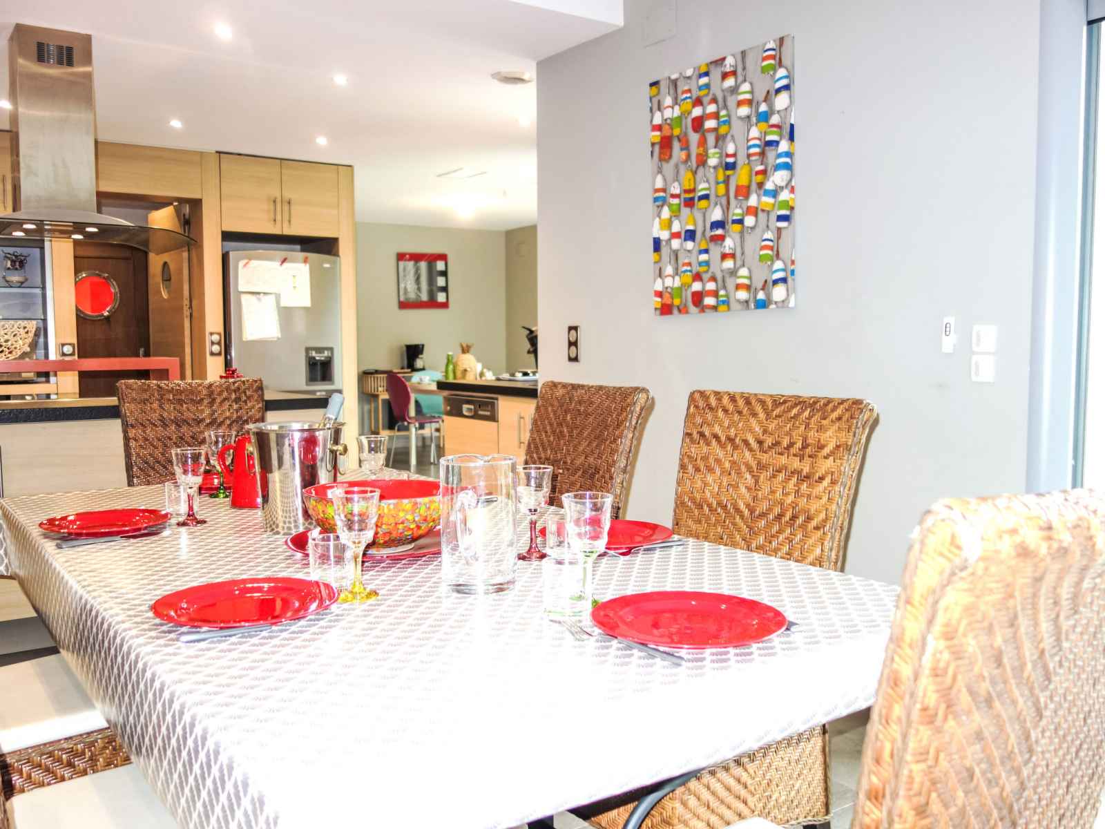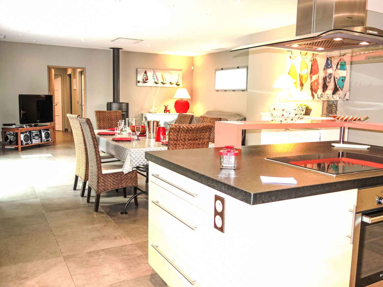 Villa 6 pièces 200 m2 sur 2 niveaux, situation sud-ouest. aménagement confortable et agréable: séjour avec coin repas et tv (écran plat). sortie sur la terrasse. 1 chambre avec 1 grand-lit, bidet et douche. sortie sur la terrasse. 1 chambre avec 1 grand-lit et douche. cuisine ouverte (four, lave-vaisselle, 4 plaques à induction, grille-pain,