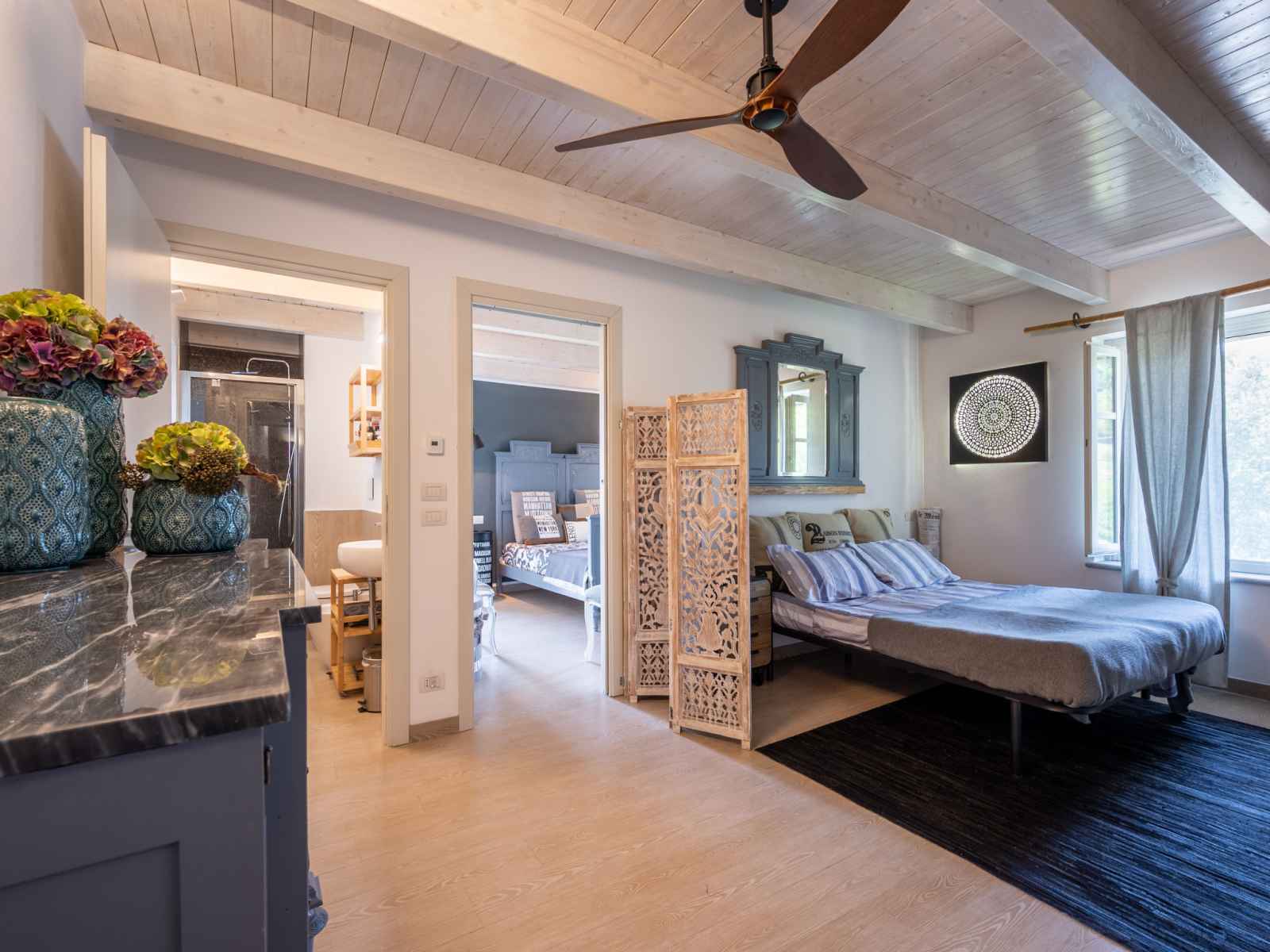 ouverte avec 2 lits. 1 chambre avec 1 lit double. Douche/WC. Chauffage. Possibilité de chauffage uniquement du 01.10. au 30.04. Sol en pierres naturelles. Grande terrasse 20 m2, couverte, grande terrasse 15 m2, couverte. Meubles de terrasse, barbecue, chaises longues (4). A disposition: lave-linge, lit bébé jusqu'à 2 ans. Internet (Connexion WIFI, gratuit). IT005005C2QUL2ZJWB