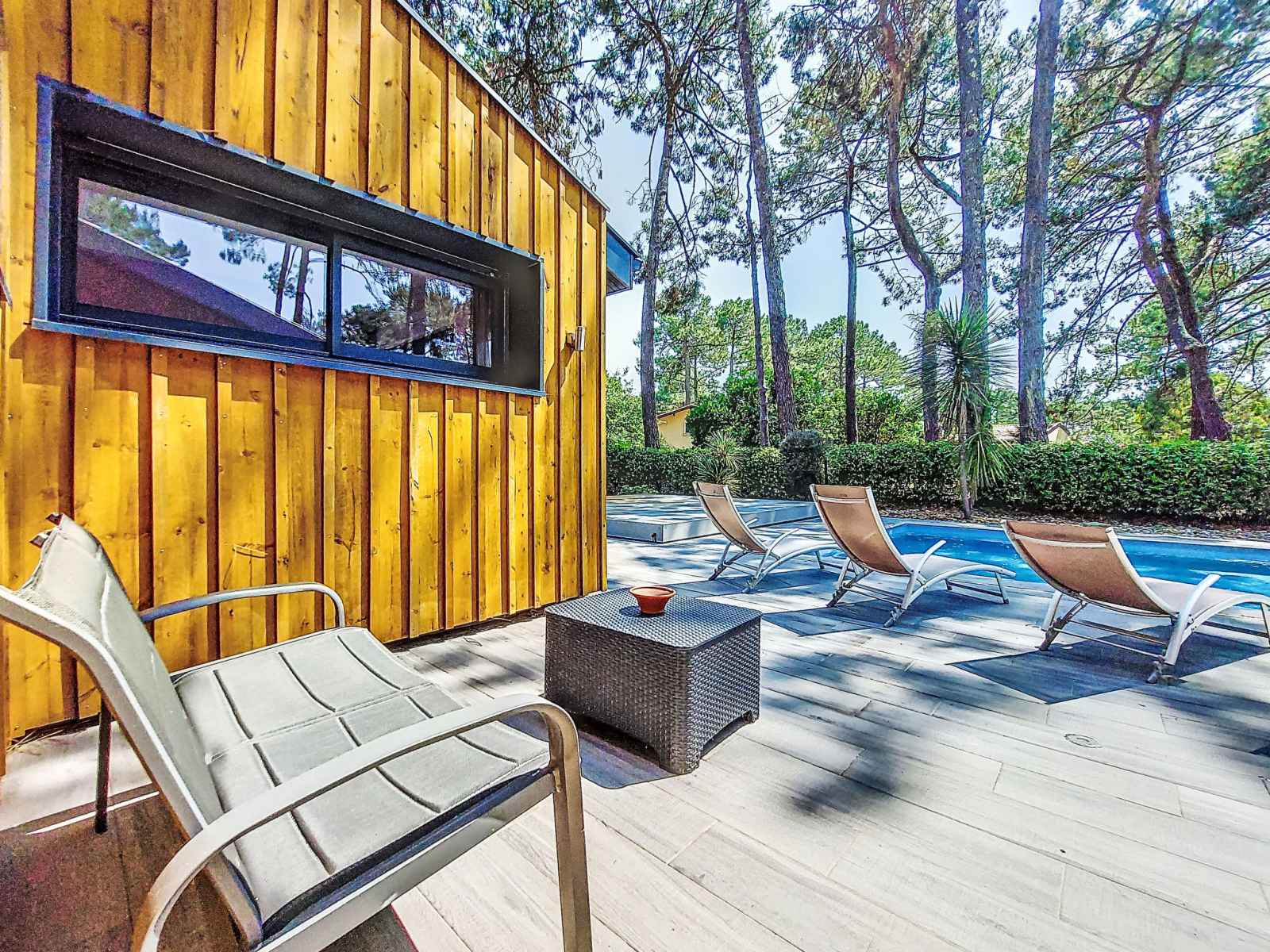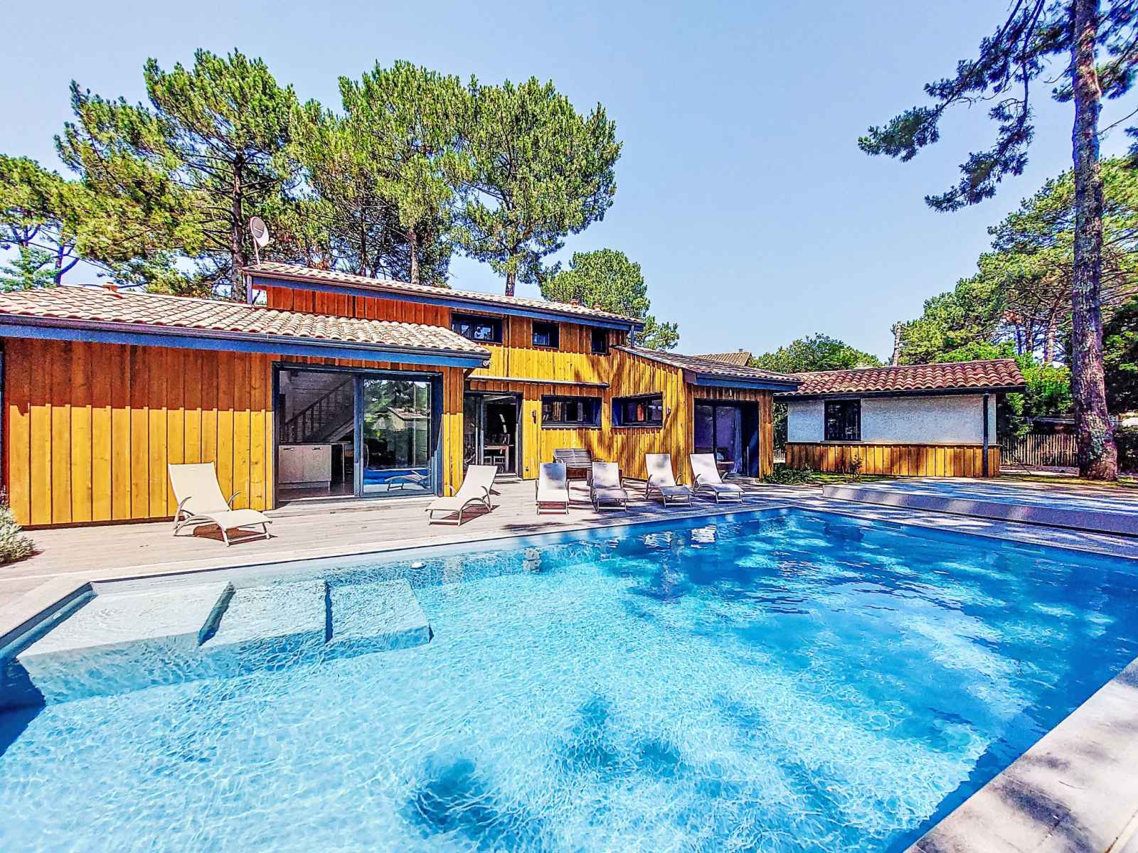 Villa "villa les verdiers". À 1 km de la mer, à 1 km de la plage. a usage privé: terrain, jardin 1'265 m2 (clôturé), piscine chauffée (9 x 4 m, profondeur 110 - 140 cm, disponibilité saisonnière: 01.jun. - 30.sep.). douche extérieure, pool house, place de parking (pour 4 voitures) sur le terrain. abri voiture. magasins, supermarché 200