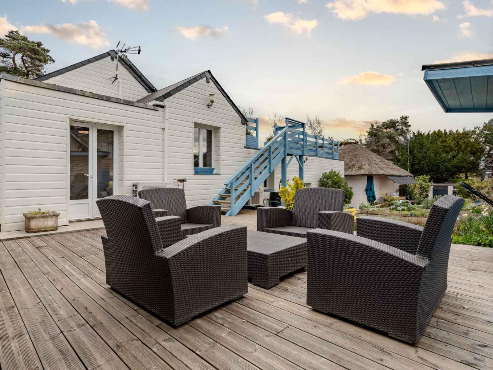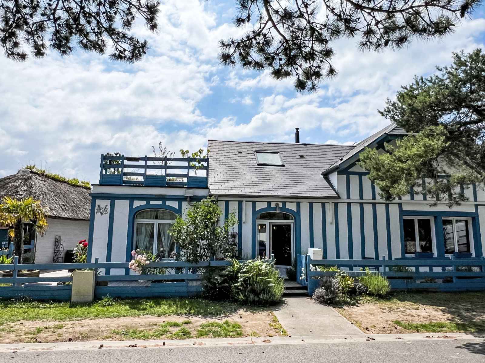 Merville franceville à 4 km de cabourg: maison individuelle "la villa bleue", de 3 étages. dans la localité, à 500 m du centre de merville franceville, à 700 m de la mer, à, de la plage. a usage privé: jardin 200 m2 (clôturé). terrasse (200 m2). infrastructures de la maison: billard. parking public possible dans la rue. magasins, magasin