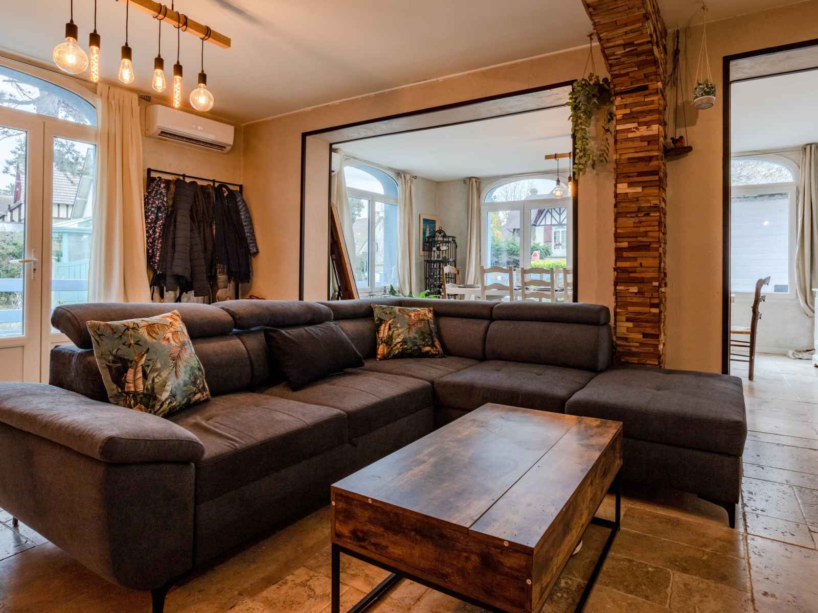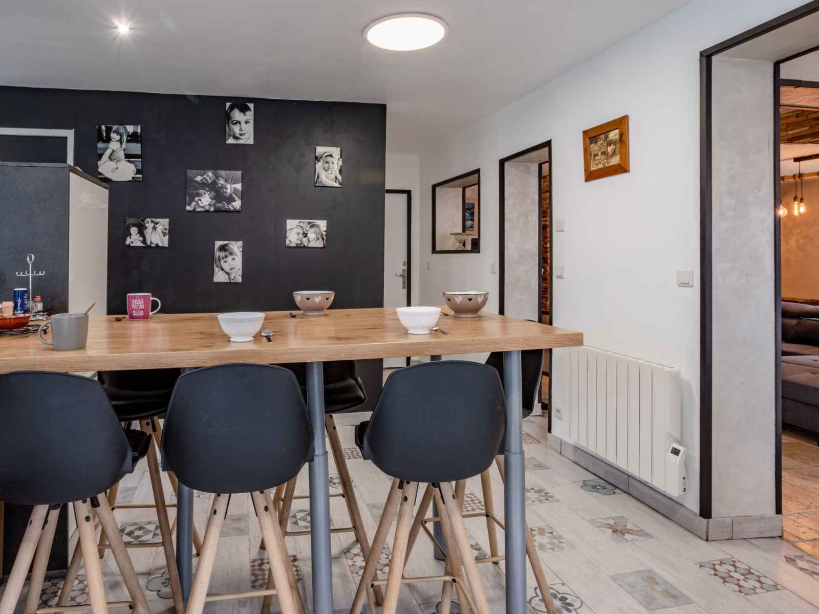 Maison 6 pièces 220 m2 sur 3 niveaux. séjour/salle à manger avec tv (écran plat), poêle à bois. grande cuisine (four, lave-vaisselle, 4 plaques vitrocéramiques, grille-pain, bouilloire électrique, micro-ondes, congélateur, cafetière électrique, capsules pour machine à café (senseo) (non incluses), ilot de cuisine). sortie sur la