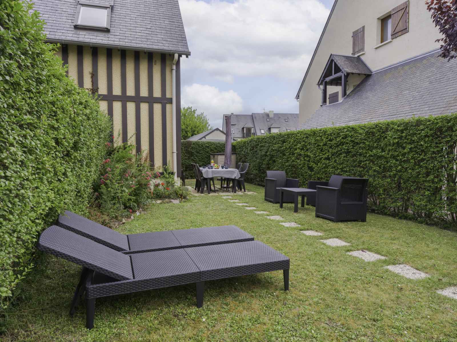 Maison mitoyenne 3 pièces 40 m2 sur 2 niveaux, situation sud. séjour/salle à manger avec tv (écran plat). sortie sur le jardin, sur la terrasse. coin cuisine (lave-vaisselle, 4 plaques vitrocéramiques, grille-pain, bouilloire électrique, micro-ondes, congélateur, cafetière électrique). À l'étage supérieur: 1 chambre avec 1 grand-lit