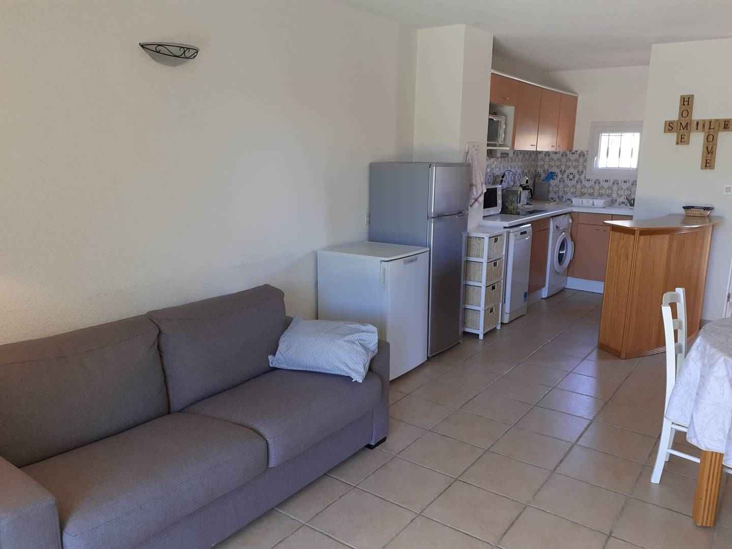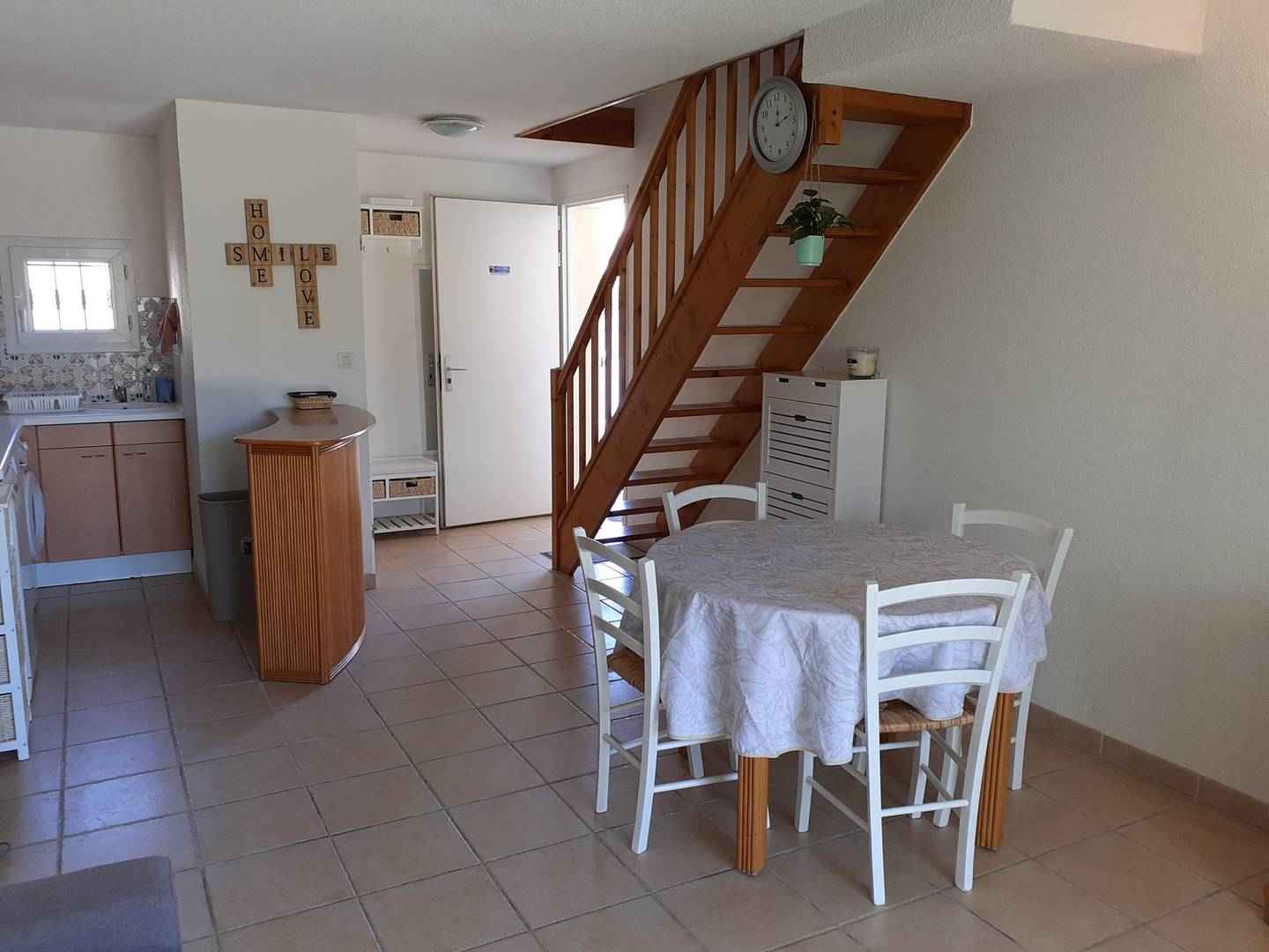 elle comprend au rez-de-chaussée: 1 séjour avec coin repas, table, chaises , 1 canapé-lit 2 personnes et tv, wc séparés, cuisine équipée avec réfrigérateur-congélateur + frigo top, 4 plaques électriques,