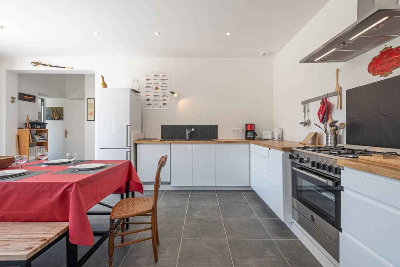 - cuisine ouverte et équipée (cuisinière piano 4 feux gaz avec four, micro-ondes, réfrigérateur-congélateur,