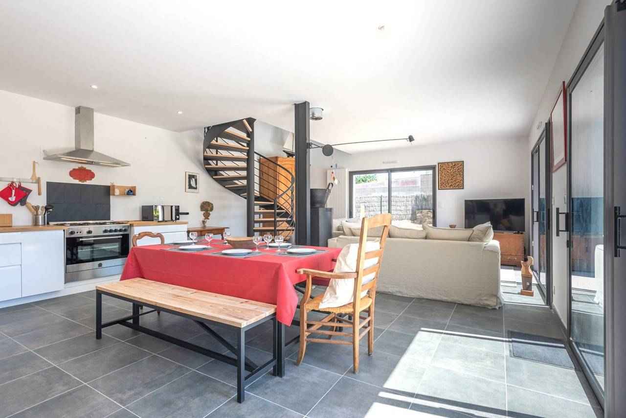 - Séjour avec partie repas (table, bancs et chaises) et partie salon (TV, 1 canapé fixe + 1 canapé convertible Rapido : couchage 2 personnes, couette) donnant sur la terrasse et prolongée par le jardin privatif clos, exposition Sud et Ouest (mobilier de jardin)